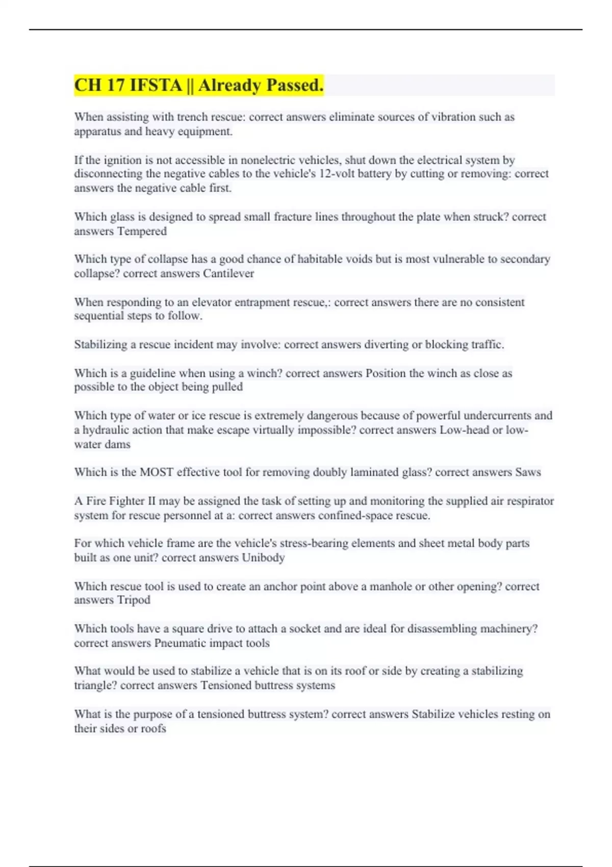 When assisting with trench rescue: correct answers eliminate sources of vibration such as apparatus and heavy equipment. If the ignition is not accessible in nonelectric vehicles, shut down the electrical system by disconnecting the negative cables to the vehicle's 12-volt battery by cutting or removing: correct answers the negative cable first. Which glass is designed to spread small fracture lines throughout the plate when struck? correct answers Tempered Which type of collapse has a good chance of habitable voids but is most vulnerable to secondary collapse? correct answers Cantilever When responding to an elevator entrapment rescue,: correct answers there are no consistent sequential steps to follow. Stabilizing a rescue incident may involve: correct answers diverting or blocking traffic. Which is a guideline when using a winch? correct answers Position the winch as close as possible to the object being pulled Which type of water or ice rescue is extremely dangerous because of powerful undercurrents and a hydraulic action that make escape virtually impossible? correct answers Low-head or low-water dams Which is the MOST effective tool for removing doubly laminated glass? correct answers Saws A Fire Fighter II may be assigned the task of setting up and monitoring the supplied air respirator system for rescue personnel at a: correct answers confined-space rescue. For which vehicle frame are the vehicle's stress-bearing elements and sheet metal body parts built as one unit? correct answers Unibody Which rescue tool is used to create an anchor point above a manhole or other opening? correct answers Tripod Which tools have a square drive to attach a socket and are ideal for disassembling machinery? correct answers Pneumatic impact tools What would be used to stabilize a vehicle that is on its roof or side by creating a stabilizing triangle? correct answers Tensioned buttress systems What is the purpose of a tensioned buttress system? correct answers Stabilize vehicles resting on their sides or roofs