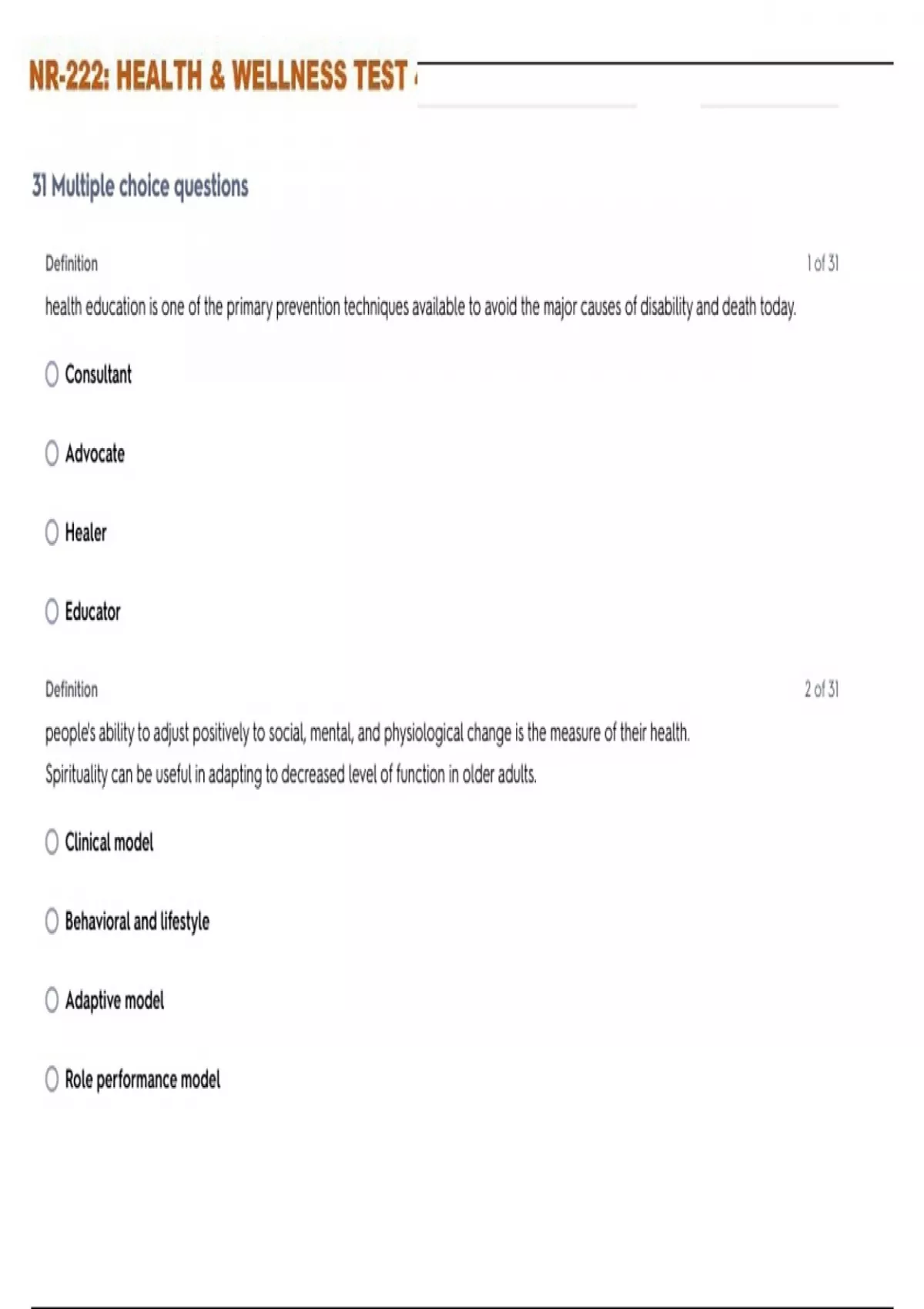 NR-222: HEALTH & WELLNESS TEST 5 QUESTIONS WITH CORRECT ANSWERS GRADED A+