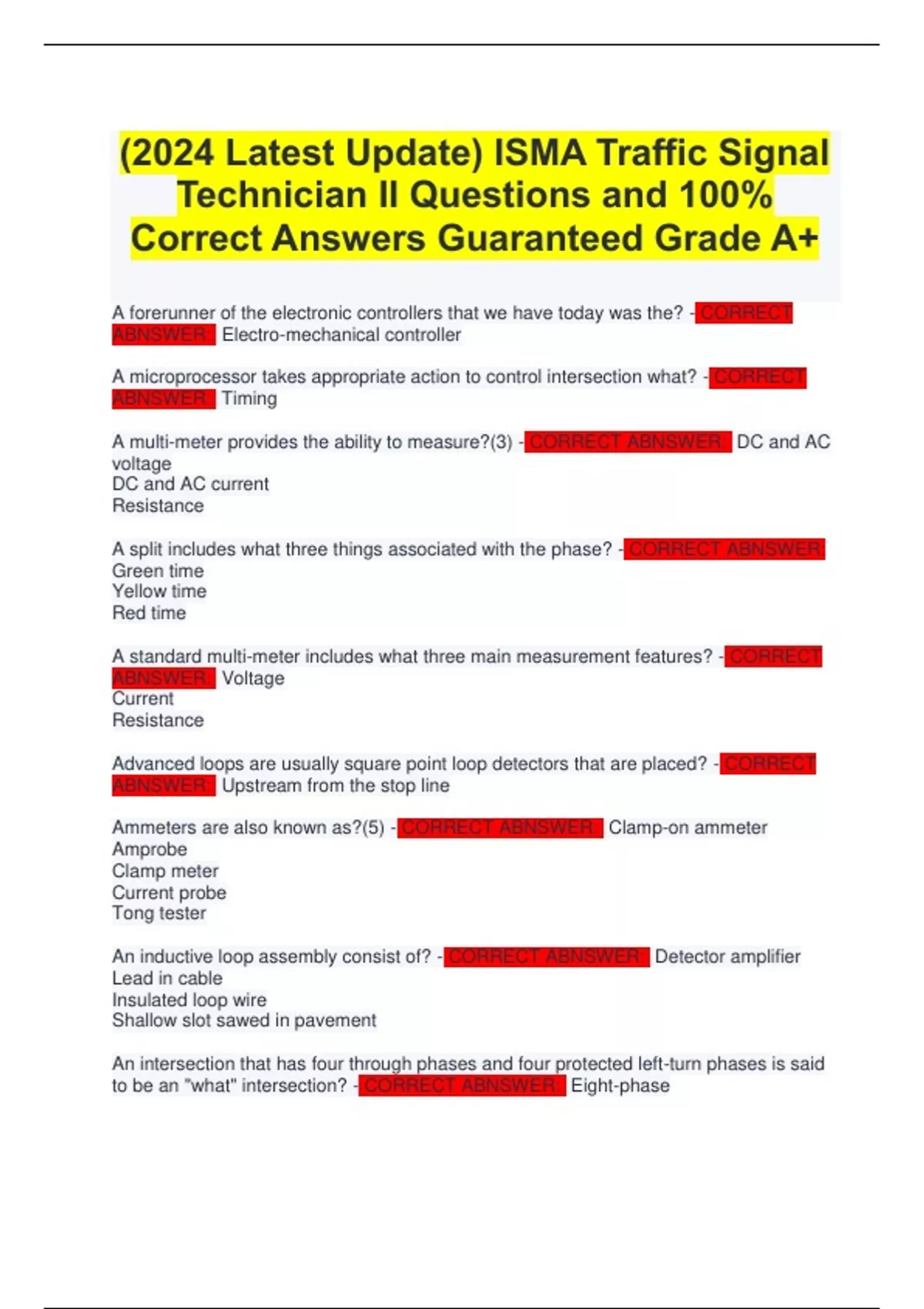 (2024 Latest Update) ISMA Traffic Signal Technician II Questions and 100% Correct Answers Guaranteed Grade A+