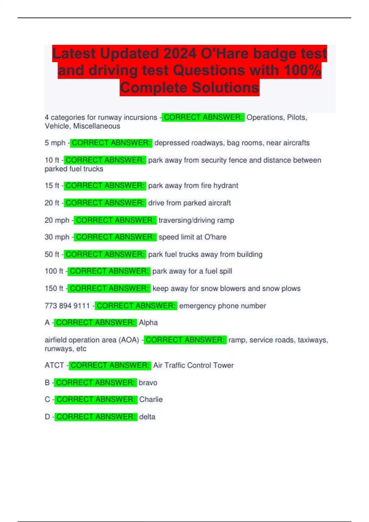 Latest Updated 2024 O'Hare badge test and driving test Questions with 100% Complete Solutions