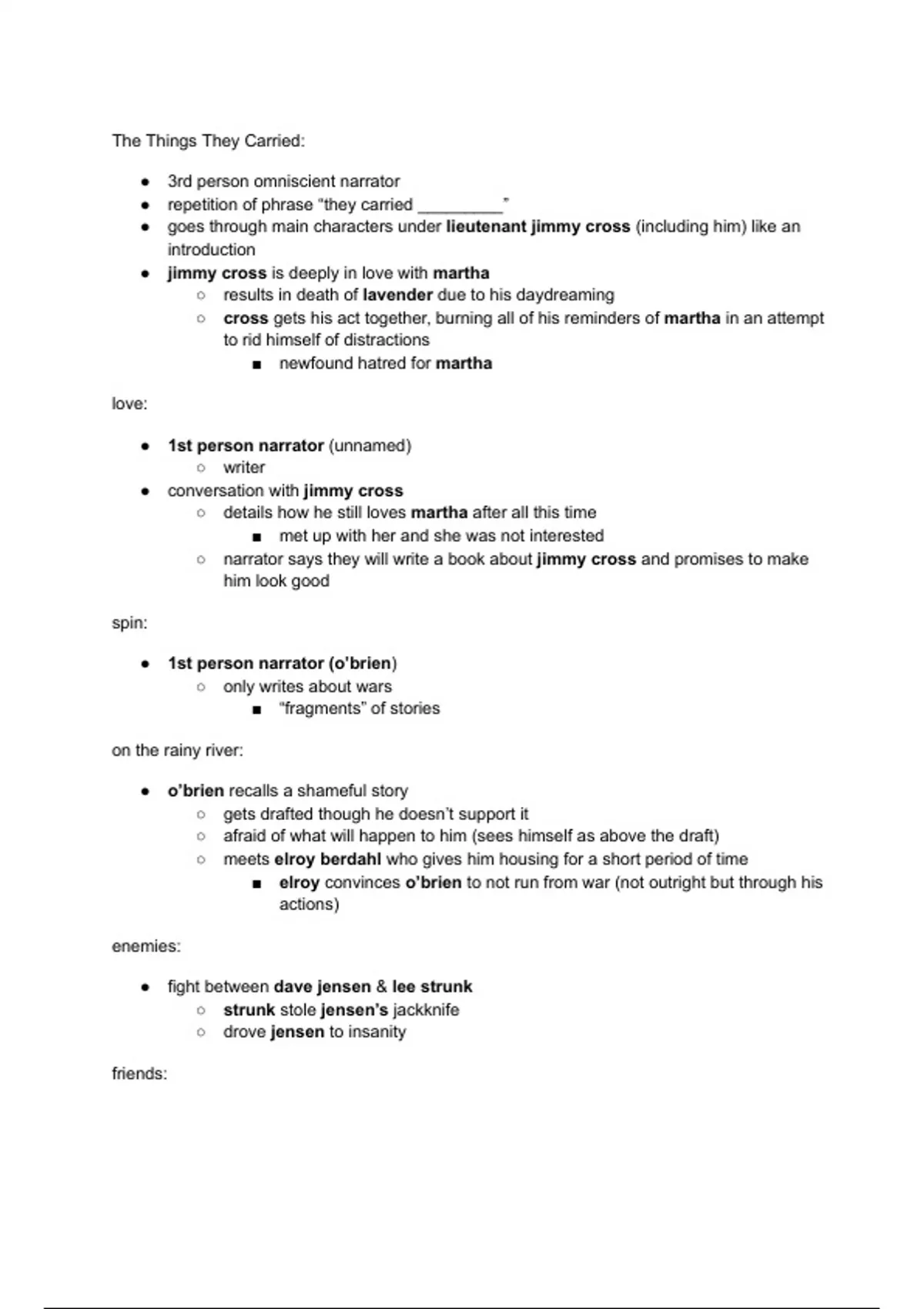 This document is a chapter by chapter summary of The Things They Carried by Tim O'Brien. This includes key figurative language as well as a list of character summaries.