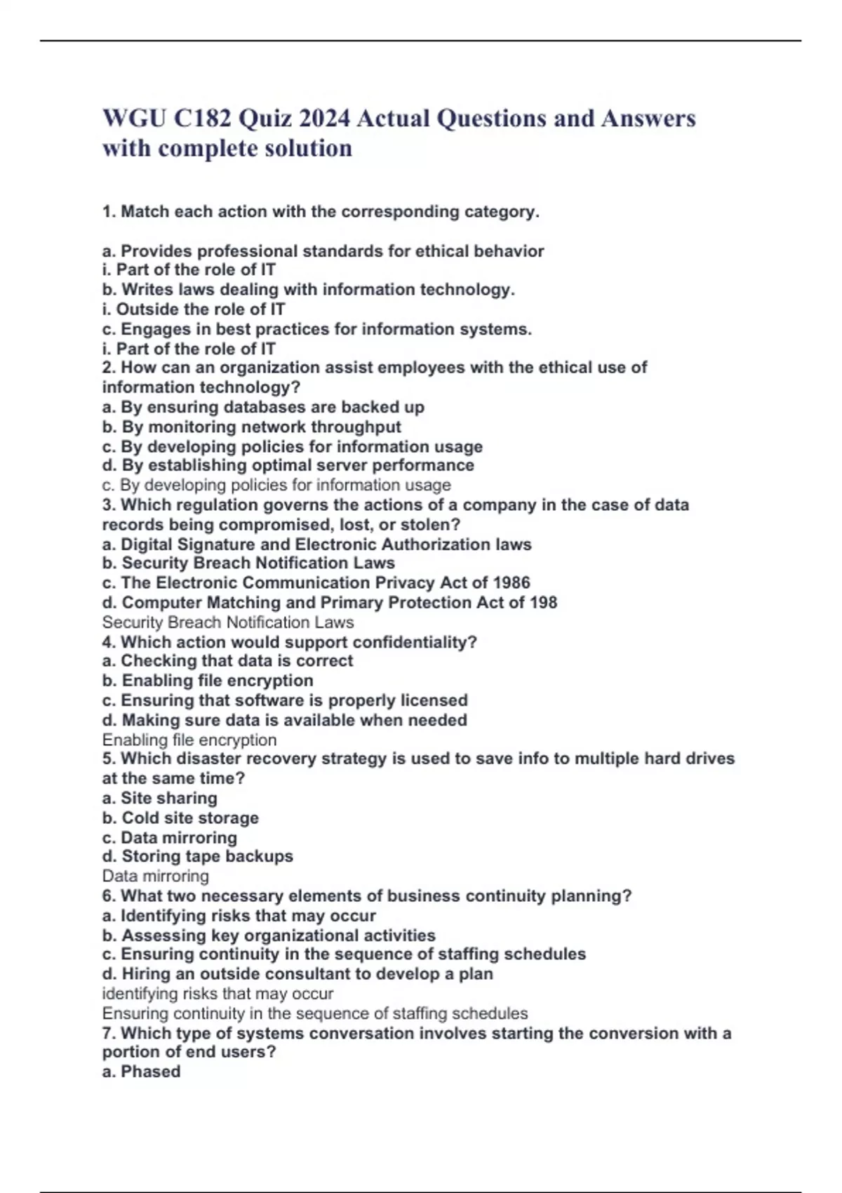 WGU C182 Quiz 2024 Actual Questions and Answers with complete solution 1. Match each action with the corresponding category. a. Provides professional standards for ethical behavior i. Part of the role of IT b. Writes laws dealing with information technology. i. Outside the role of IT c. Engages in best practices for information systems. i. Part of the role of IT 2. How can an organization assist employees with the ethical use of information technology? a. By ensuring databases are backed up b. By monitoring network throughput c. By developing policies for information usage d. By establishing optimal server performance c. By developing policies for information usage 3. Which regulation governs the actions of a company in the case of data records being compromised, lost, or stolen? a. Digital Signature and Electronic Authorization laws b. Security Breach Notification Laws c. The Electronic Communication Privacy Act of 1986 d. Computer Matching and Primary Protection Act of 198 Security Breach Notification Laws 4. Which action would support confidentiality? a. Checking that data is correct b. Enabling file encryption c. Ensuring that software is properly licensed d. Making sure data is available when needed Enabling file encryption 5. Which disaster recovery strategy is used to save info to multiple hard drives at the same time? a. Site sharing b. Cold site storage c. Data mirroring d. Storing tape backups Data mirroring 6. What two necessary elements of business continuity planning? a. Identifying risks that may occur b. Assessing key organizational activities c. Ensuring continuity in the sequence of staffing schedules d. Hiring an outside consultant to develop a plan identifying risks that may occur Ensuring continuity in the sequence of staffing schedules 7. Which type of systems conversation involves starting the conversion with a portion of end users? a. Phased