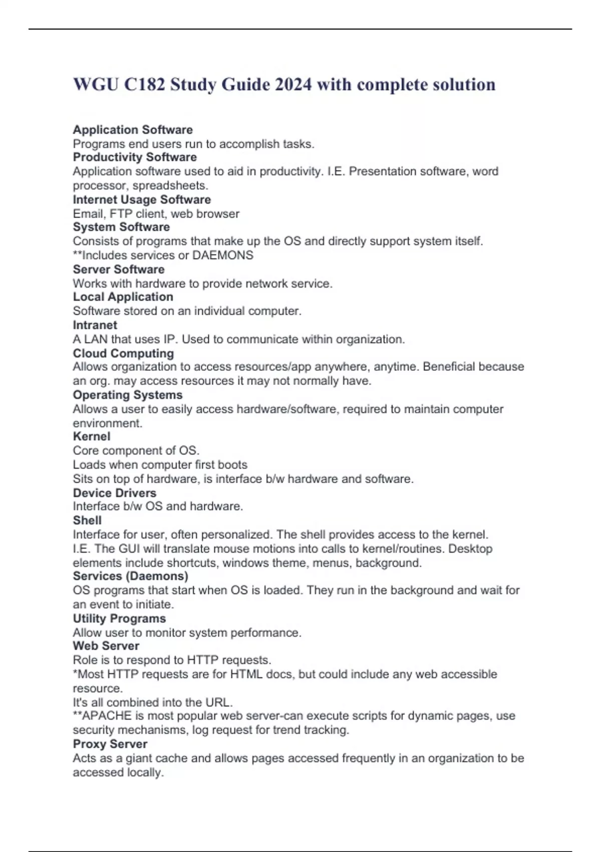 WGU C182 Study Guide 2024 with complete solution Application Software Programs end users run to accomplish tasks. Productivity Software Application software used to aid in productivity. I.E. Presentation software, word processor, spreadsheets. Internet Usage Software Email, FTP client, web browser System Software Consists of programs that make up the OS and directly support system itself. **Includes services or DAEMONS Server Software Works with hardware to provide network service. Local Application Software stored on an individual computer. Intranet A LAN that uses IP. Used to communicate within organization. Cloud Computing Allows organization to access resources/app anywhere, anytime. Beneficial because an org. may access resources it may not normally have. Operating Systems Allows a user to easily access hardware/software, required to maintain computer environment. Kernel Core component of OS. Loads when computer first boots Sits on top of hardware, is interface b/w hardware and software. Device Drivers Interface b/w OS and hardware. Shell Interface for user, often personalized. The shell provides access to the kernel. I.E. The GUI will translate mouse motions into calls to kernel/routines. Desktop elements include shortcuts, windows theme, menus, background. Services (Daemons) OS programs that start when OS is loaded. They run in the background and wait for an event to initiate. Utility Programs Allow user to monitor system performance. Web Server Role is to respond to HTTP requests. *Most HTTP requests are for HTML docs, but could include any web accessible resource. It's all combined into the URL. **APACHE is most popular web server-can execute scripts for dynamic pages, use security mechanisms, log request for trend tracking. Proxy Server Acts as a giant cache and allows pages accessed frequently in an organization to be accessed locally.