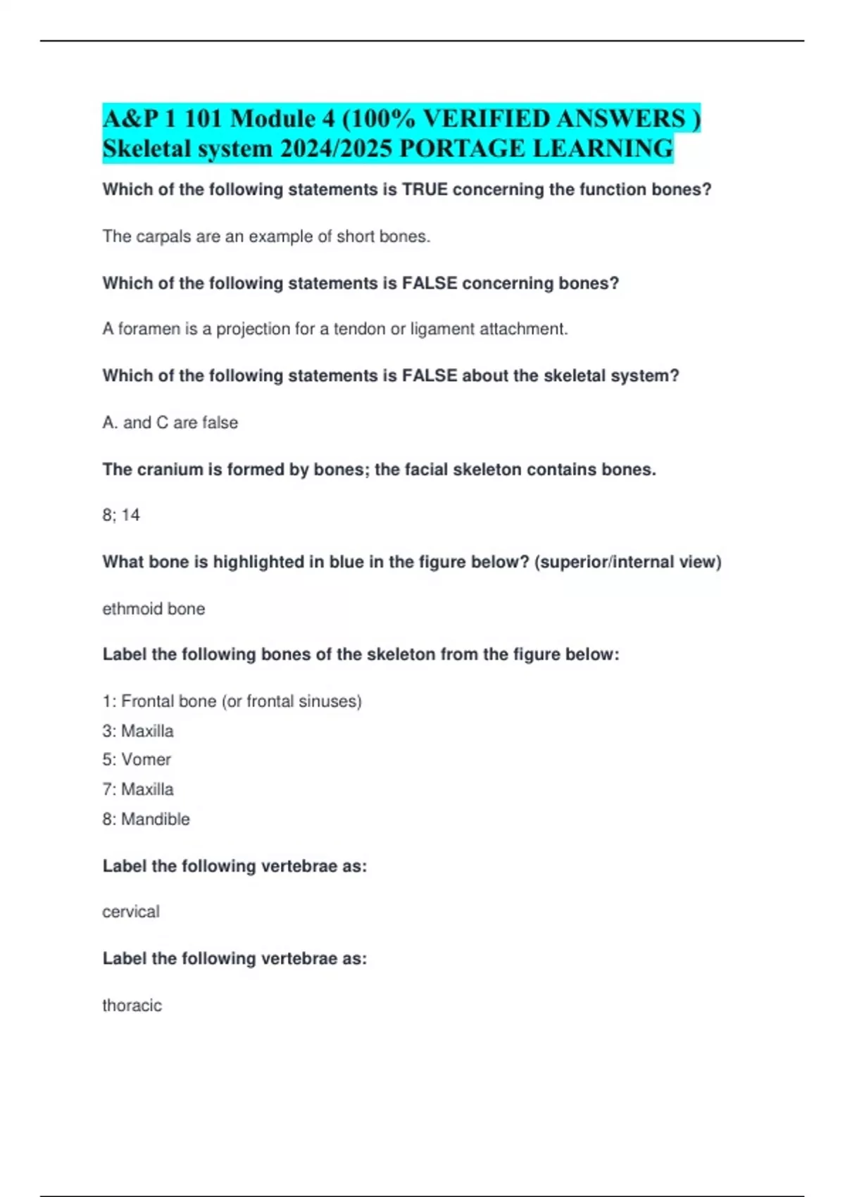 A&P 1 101 Module 4 (100% VERIFIED ANSWERS ) Skeletal system 2024/2025 PORTAGE LEARNING