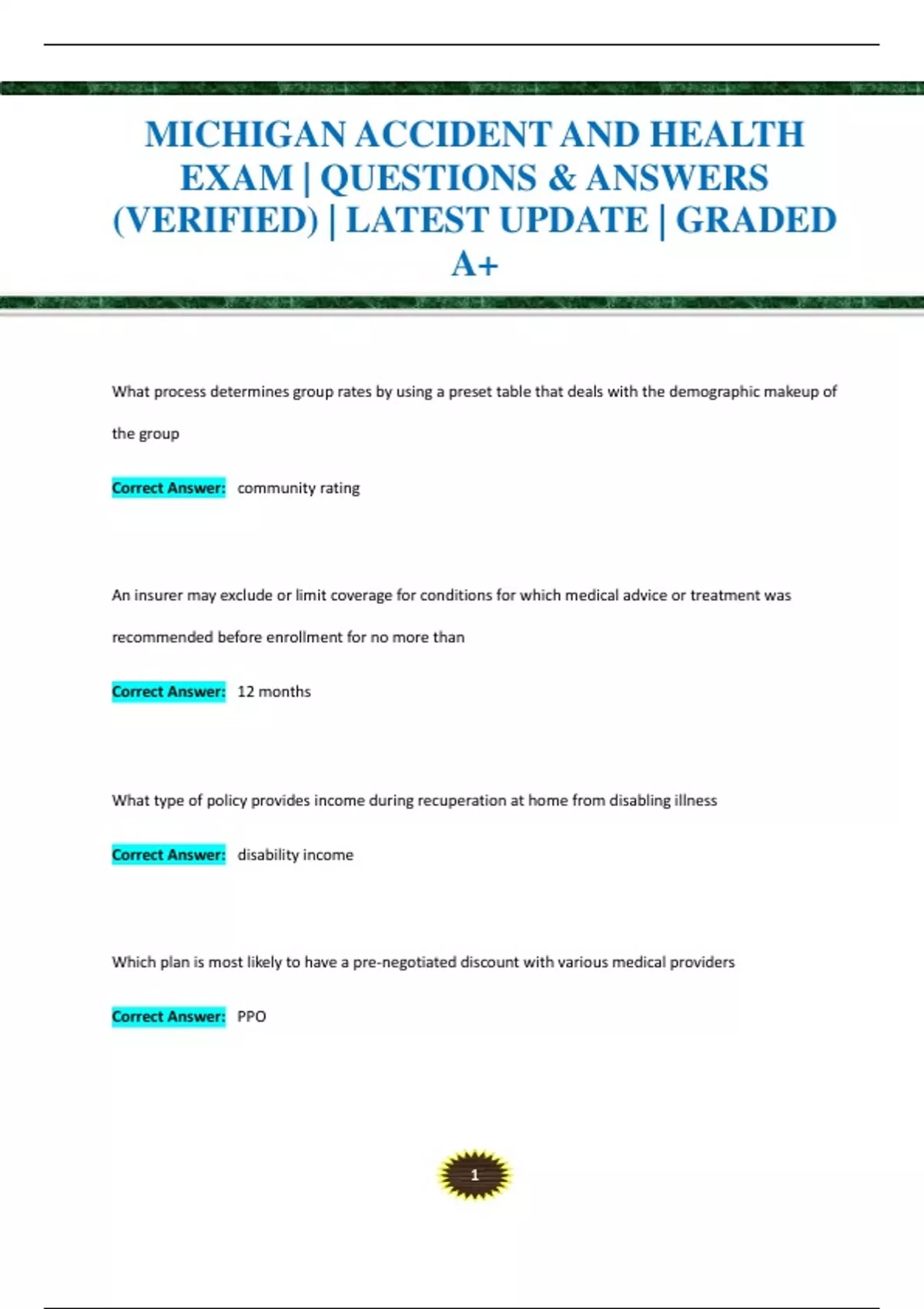 MICHIGAN ACCIDENT AND HEALTH EXAM | QUESTIONS & ANSWERS (VERIFIED) | LATEST UPDATE | GRADED A+
