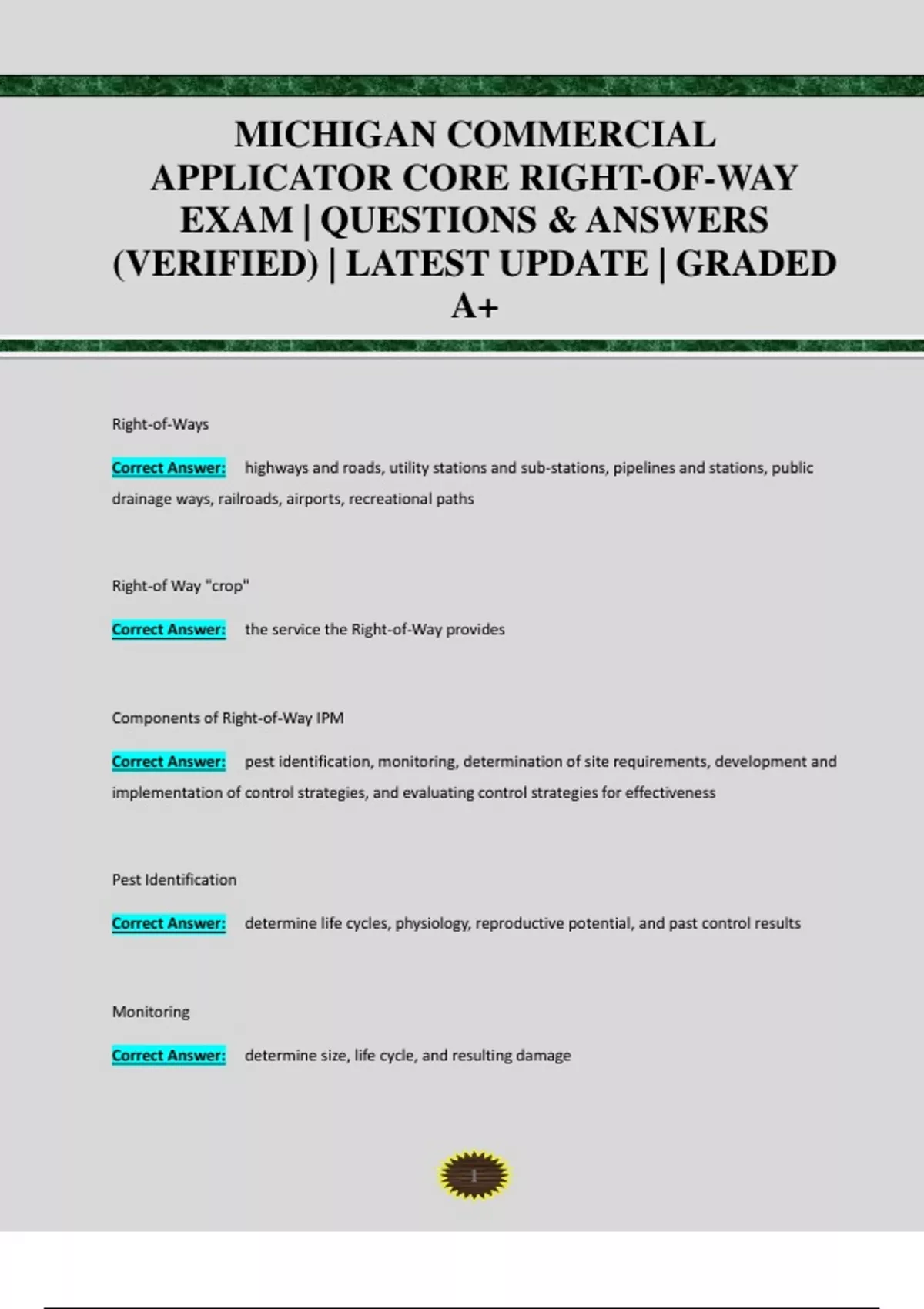 MICHIGAN COMMERCIAL APPLICATOR CORE RIGHT-OF-WAY EXAM | QUESTIONS & ANSWERS (VERIFIED) | LATEST UPDATE | GRADED A+