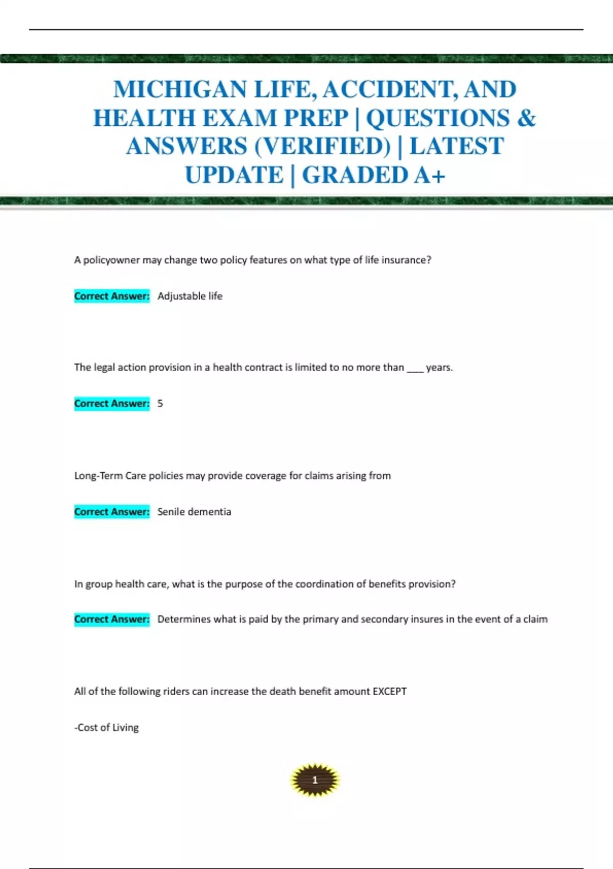MICHIGAN LIFE, ACCIDENT, AND HEALTH EXAM PREP | QUESTIONS & ANSWERS (VERIFIED) | LATEST UPDATE | GRADED A+