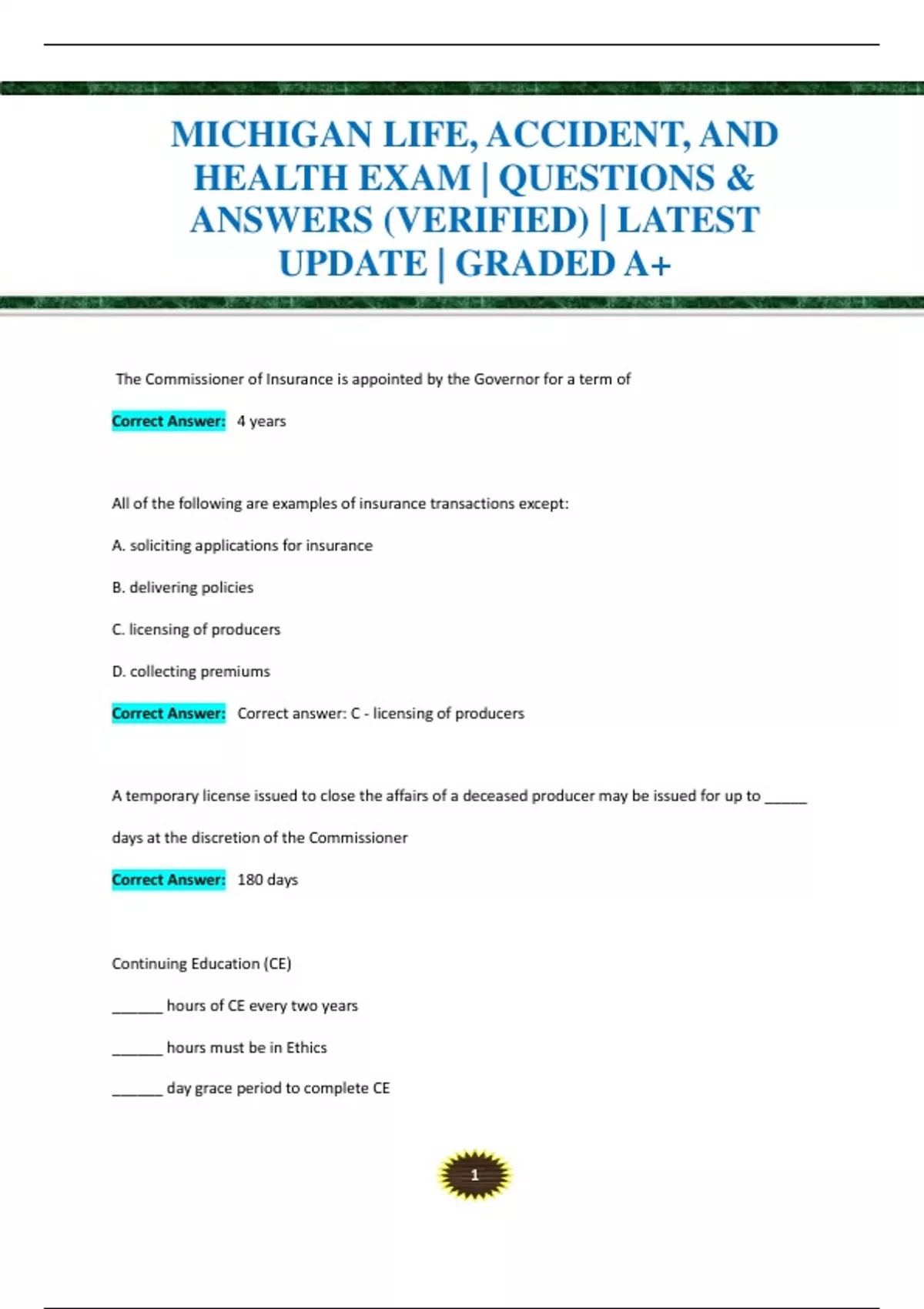 MICHIGAN LIFE, ACCIDENT, AND HEALTH EXAM | QUESTIONS & ANSWERS (VERIFIED) | LATEST UPDATE | GRADED A+