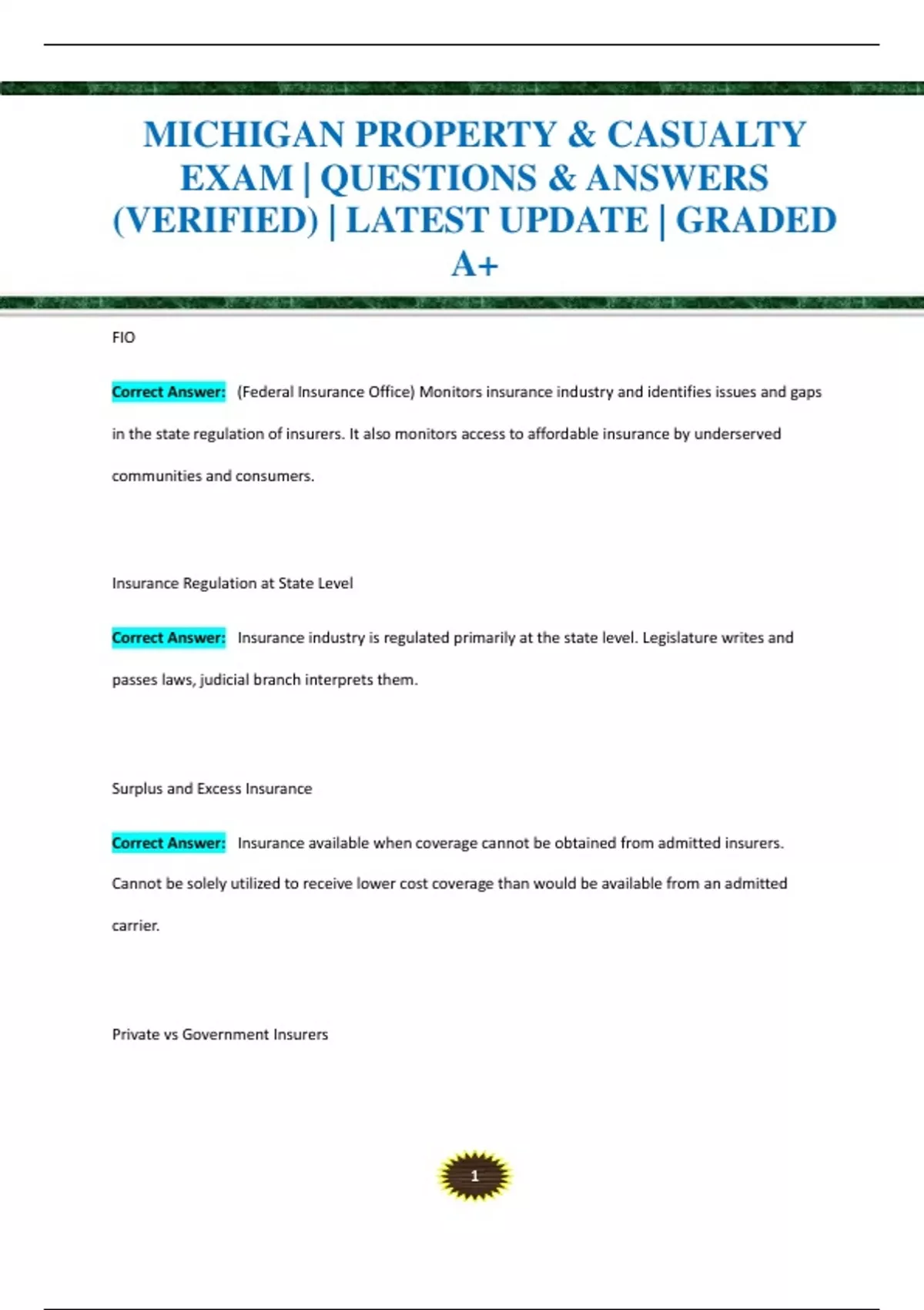 MICHIGAN PROPERTY & CASUALTY EXAM | QUESTIONS & ANSWERS (VERIFIED) | LATEST UPDATE | GRADED A+