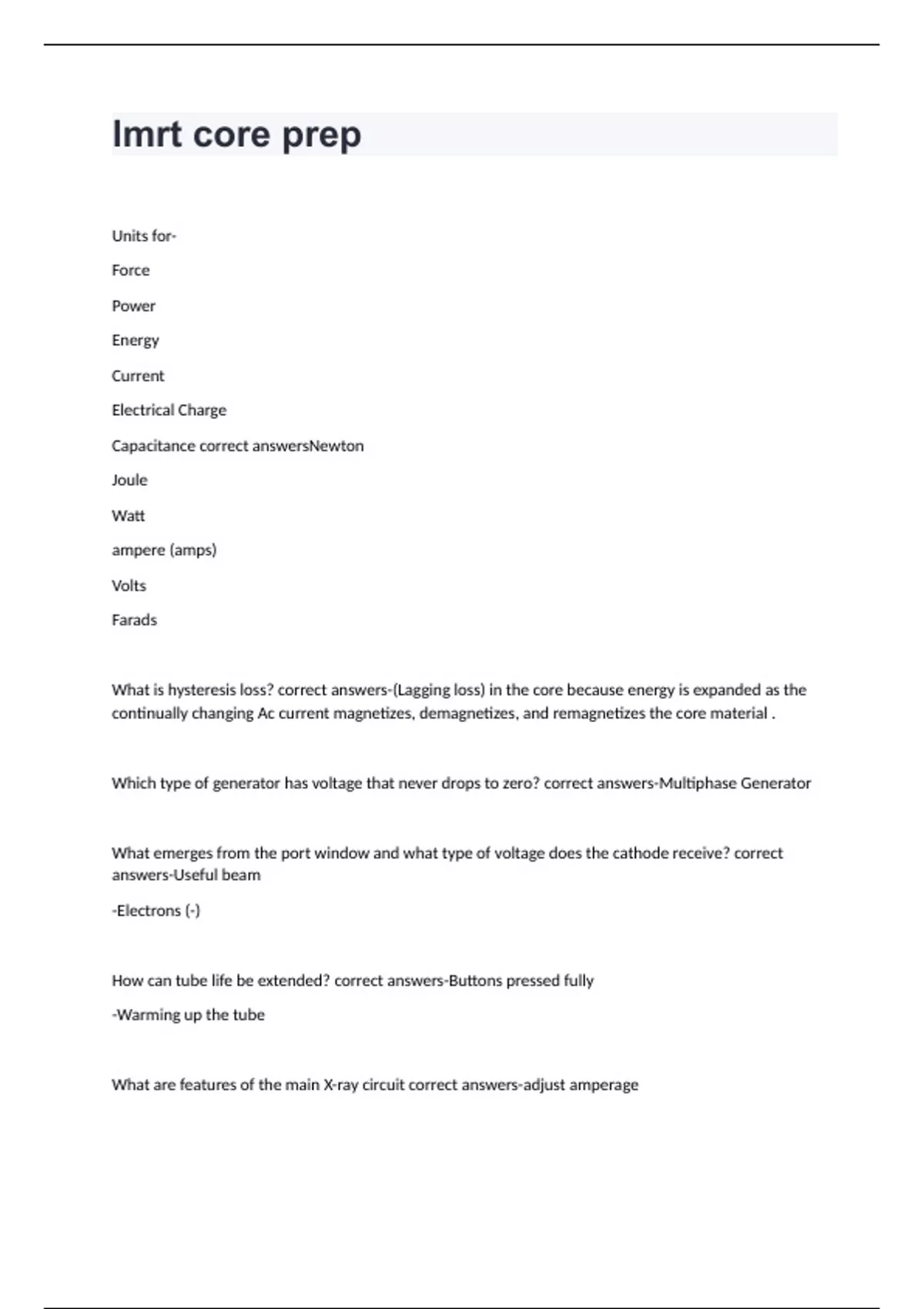 Units for- Force Power Energy Current Electrical Charge Capacitance correct answersNewton Joule Watt ampere (amps) Volts Farads What is hysteresis loss? correct answers-(Lagging loss) in the core because energy is expanded as the continually changing Ac current magnetizes, demagnetizes, and remagnetizes the core material . Which type of generator has voltage that never drops to zero? correct answers-Multiphase Generator What emerges from the port window and what type of voltage does the cathode receive? correct answers-Useful beam -Electrons (-) How can tube life be extended? correct answers-Buttons pressed fully -Warming up the tube What are features of the main X-ray circuit correct answers-adjust amperage