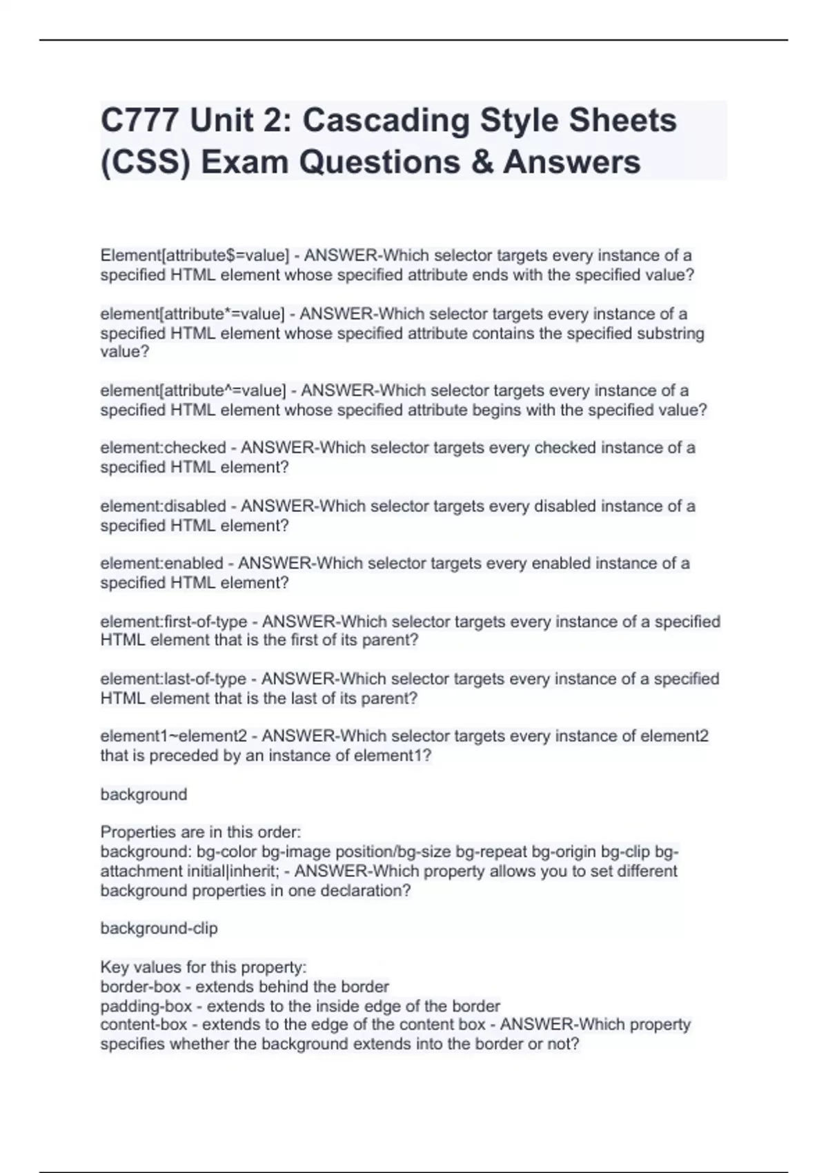 element[attribute*=value] - ANSWER-Which selector targets every instance of a specified HTML element whose specified attribute contains the specified substring value? element[attribute^=value] - ANSWER-Which selector targets every instance of a specified HTML element whose specified attribute begins with the specified value? element:checked - ANSWER-Which selector targets every checked instance of a specified HTML element? element:disabled - ANSWER-Which selector targets every disabled instance of a specified HTML element? element:enabled - ANSWER-Which selector targets every enabled instance of a specified HTML element? element:first-of-type - ANSWER-Which selector targets every instance of a specified HTML element that is the first of its parent? element:last-of-type - ANSWER-Which selector targets every instance of a specified HTML element that is the last of its parent? element1~element2 - ANSWER-Which selector targets every instance of element2 that is preceded by an instance of element1? background Properties are in this order: background: bg-color bg-image position/bg-size bg-repeat bg-origin bg-clip bg-attachment initial|inherit; - ANSWER-Which property allows you to set different background properties in one declaration? background-clip Key values for this property: border-box - extends behind the border padding-box - extends to the inside edge of the border content-box - extends to the edge of the content box - ANSWER-Which property specifies whether the background extends into the border or not?