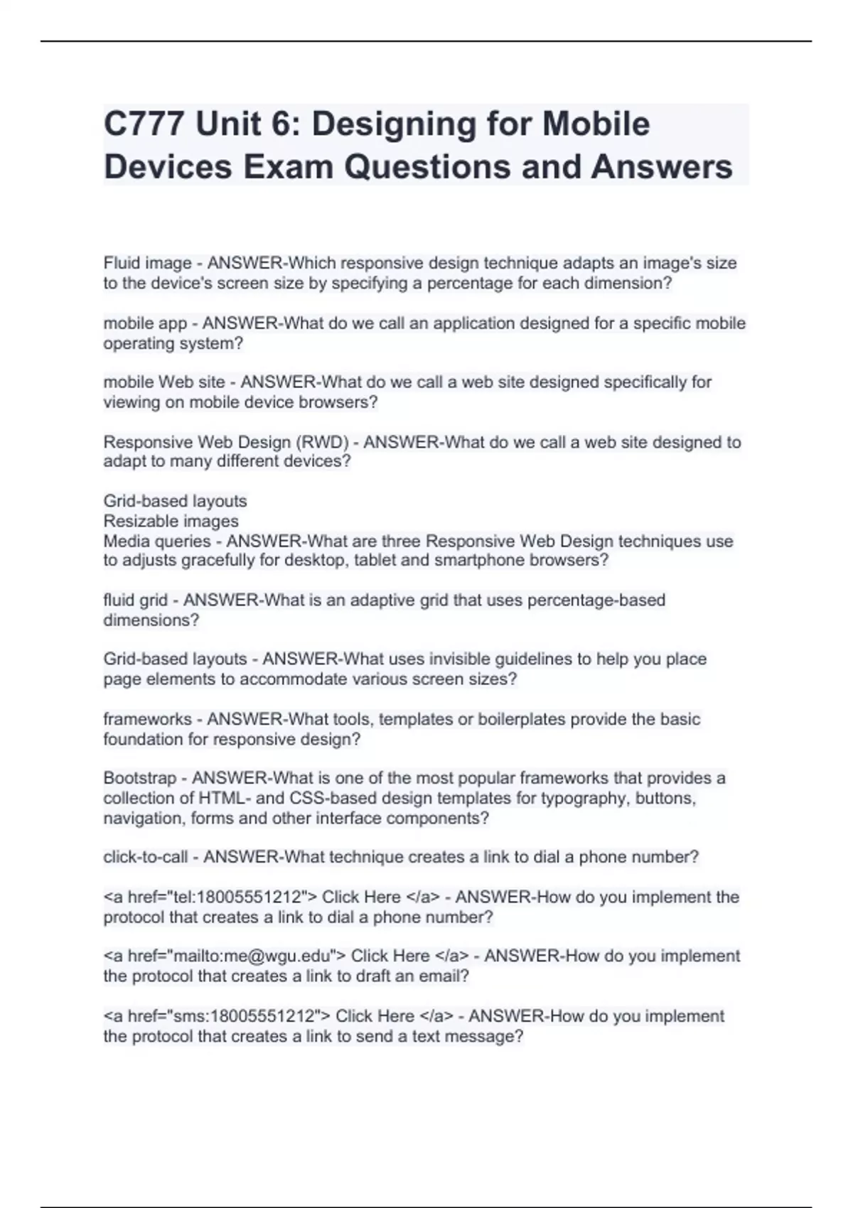 C777 Unit 6: Designing for Mobile Devices Exam Questions and Answers