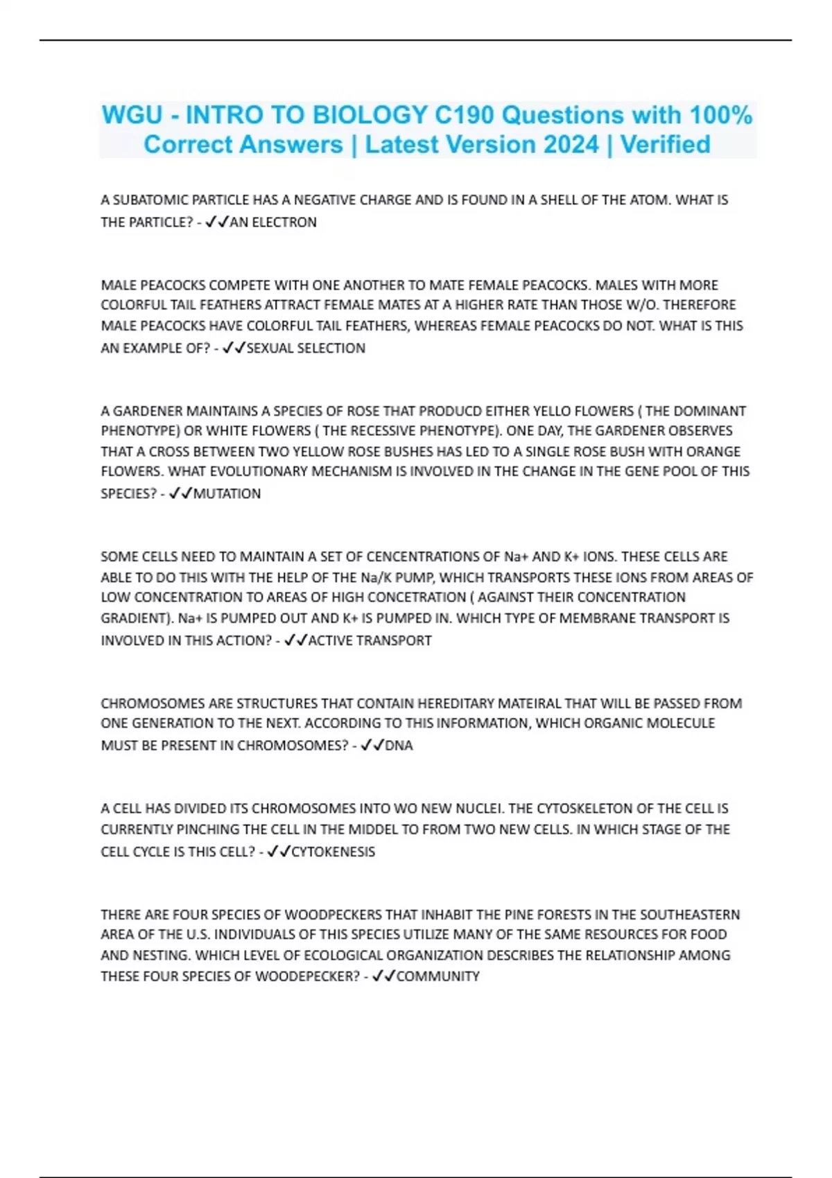 WGU - INTRO TO BIOLOGY C190 Questions with 100% Correct Answers | Latest Version 2024 | Verified A SUBATOMIC PARTICLE HAS A NEGATIVE CHARGE AND IS FOUND IN A SHELL OF THE ATOM. WHAT IS THE PARTICLE? - AN ELECTRON MALE PEACOCKS COMPETE WITH ONE ANOTHER TO MATE FEMALE PEACOCKS. MALES WITH MORE COLORFUL TAIL FEATHERS ATTRACT FEMALE MATES AT A HIGHER RATE THAN THOSE W/O. THEREFORE MALE PEACOCKS HAVE COLORFUL TAIL FEATHERS, WHEREAS FEMALE PEACOCKS DO NOT. WHAT IS THIS AN EXAMPLE OF? - SEXUAL SELECTION A GARDENER MAINTAINS A SPECIES OF ROSE THAT PRODUCD EITHER YELLO FLOWERS ( THE DOMINANT PHENOTYPE) OR WHITE FLOWERS ( THE RECESSIVE PHENOTYPE). ONE DAY, THE GARDENER OBSERVES THAT A CROSS BETWEEN TWO YELLOW ROSE BUSHES HAS LED TO A SINGLE ROSE BUSH WITH ORANGE FLOWERS. WHAT EVOLUTIONARY MECHANISM IS INVOLVED IN THE CHANGE IN THE GENE POOL OF THIS SPECIES? - MUTATION SOME CELLS NEED TO MAINTAIN A SET OF CENCENTRATIONS OF Na+ AND K+ IONS. THESE CELLS ARE ABLE TO DO THIS WITH THE HELP OF THE Na/K PUMP, WHICH TRANSPORTS THESE IONS FROM AREAS OF LOW CONCENTRATION TO AREAS OF HIGH CONCETRATION ( AGAINST THEIR CONCENTRATION GRADIENT). Na+ IS PUMPED OUT AND K+ IS PUMPED IN. WHICH TYPE OF MEMBRANE TRANSPORT IS INVOLVED IN THIS ACTION? - ACTIVE TRANSPORT CHROMOSOMES ARE STRUCTURES THAT CONTAIN HEREDITARY MATEIRAL THAT WILL BE PASSED FROM ONE GENERATION TO THE NEXT. ACCORDING TO THIS INFORMATION, WHICH ORGANIC MOLECULE MUST BE PRESENT IN CHROMOSOMES? - DNA A CELL HAS DIVIDED ITS CHROMOSOMES INTO WO NEW NUCLEI. THE CYTOSKELETON OF THE CELL IS CURRENTLY PINCHING THE CELL IN THE MIDDEL TO FROM TWO NEW CELLS. IN WHICH STAGE OF THE CELL CYCLE IS THIS CELL? - CYTOKENESIS THERE ARE FOUR SPECIES OF WOODPECKERS THAT INHABIT THE PINE FORESTS IN THE SOUTHEASTERN AREA OF THE U.S. INDIVIDUALS OF THIS SPECIES UTILIZE MANY OF THE SAME RESOURCES FOR FOOD AND NESTING. WHICH LEVEL OF ECOLOGICAL ORGANIZATION DESCRIBES THE RELATIONSHIP AMONG THESE FOUR SPECIES OF WOODEPECKER? - COMMUNITYTWO SPECIES OF WOODPECKER INHABIT THE SAME LOBLOLLY PINE WOODLAND THROUGHOUT THE SOUTHEASTERN U.S. EACH SPECIES REQUIRES RECENTLY DECEASED (BUT STILL STANDING) PINE TREES FOR REPRODUCTION . THE WOODPECKERS EXCAVATE THEIR NEST CAVITIES IN THE DEAD PINE TREES. IN MOST HEALTHY FORESTS THERE ARE GENERALLY NOT ENOUGH DEAD PINE TRESS TO PROVIDE NESTS FOR ALL THE WOODPECKERS THAT WANT TO BUILD THEM. WHAT IS THE RELATIONSHIP BETWEEN THESE TWO SPECIES OF WOODPECKER AN EXAMPLE OF? - COMPETITION