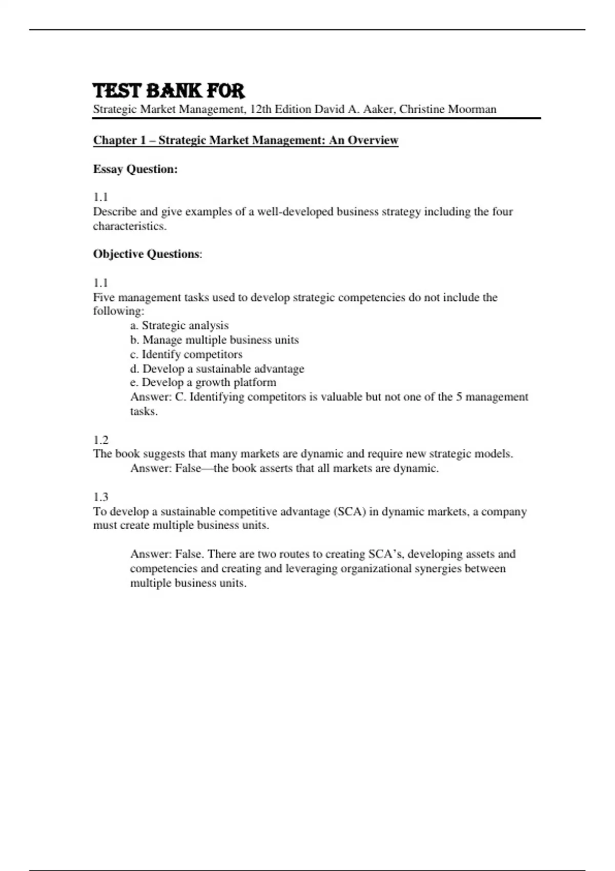 Test Bank For Strategic Market Management, 12th Edition by David A. Aaker, Christine Moorman