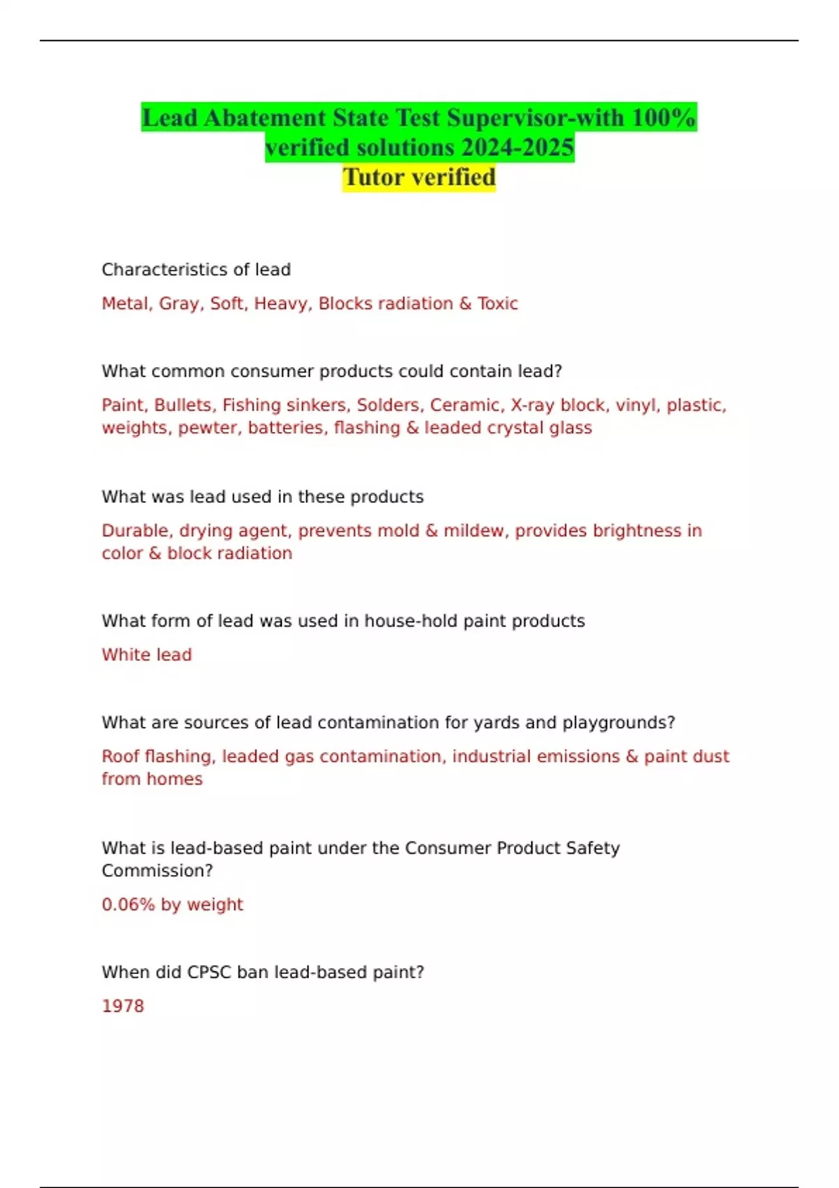 Lead Abatement State Test Supervisor-with 100% verified solutions