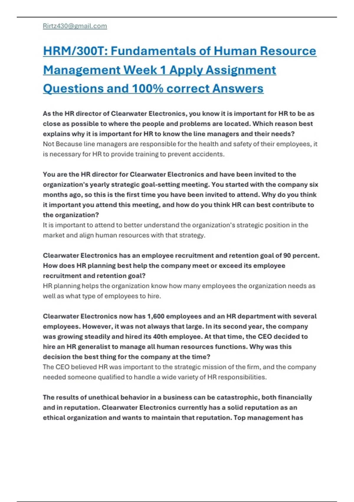 2024 HRM/300T: Fundamentals of Human Resource Management Week 1 Apply Assignment Questions and 100% correct Answers