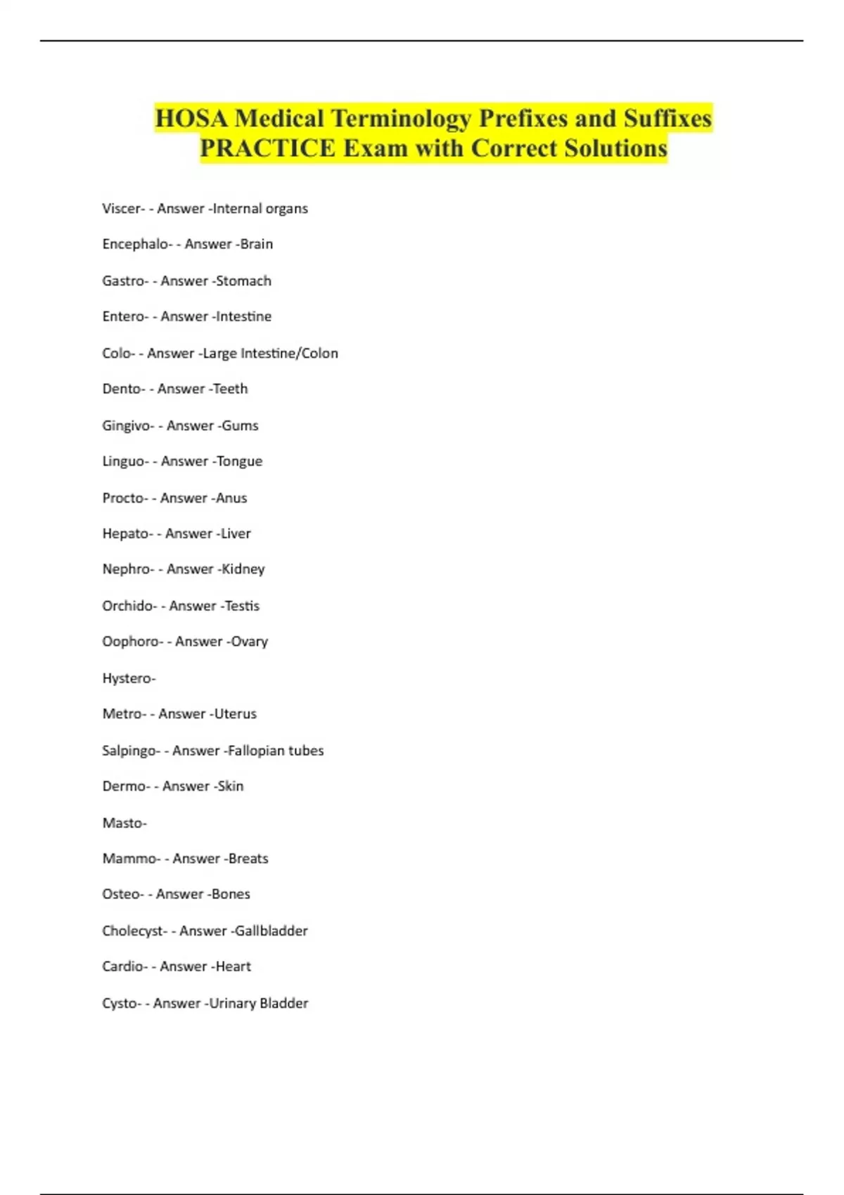 HOSA Medical Terminology Prefixes and Suffixes PRACTICE Exam with Correct Solutions Viscer- - Answer -Internal organs Encephalo- - Answer -Brain Gastro- - Answer -Stomach Entero- - Answer -Intestine Colo- - Answer -Large Intestine/Colon Dento- - Answer -Teeth Gingivo- - Answer -Gums Linguo- - Answer -Tongue Procto- - Answer -Anus Hepato- - Answer -Liver Nephro- - Answer -Kidney Orchido- - Answer -Testis Oophoro- - Answer -Ovary HysteroMetro- - Answer -Uterus Salpingo- - Answer -Fallopian tubes Dermo- - Answer -Skin MastoMammo- - Answer -Breats Osteo- - Answer -Bones Cholecyst- - Answer -Gallbladder Cardio- - Answer -Heart Cysto- - Answer -Urinary