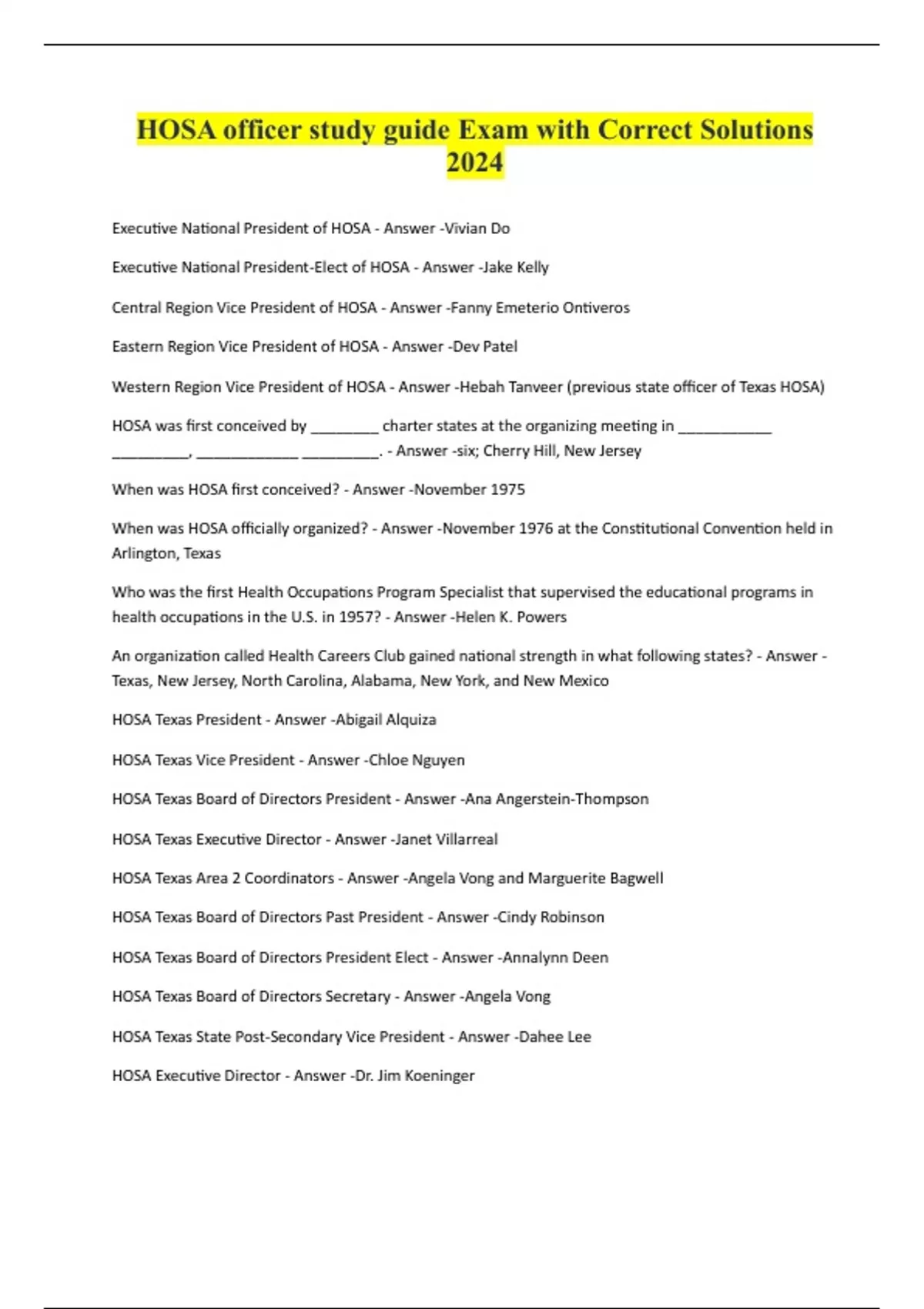 HOSA officer study guide Exam with Correct Solutions 2024 Executive National President of HOSA - Answer -Vivian Do Executive National President-Elect of HOSA - Answer -Jake Kelly Central Region Vice President of HOSA - Answer -Fanny Emeterio Ontiveros Eastern Region Vice President of HOSA - Answer -Dev Patel Western Region Vice President of HOSA - Answer -Hebah Tanveer (previous state officer of Texas HOSA) HOSA was first conceived by ________ charter states at the organizing meeting in ___________ _________, ____________ _________. - Answer -six; Cherry Hill, New Jersey When was HOSA first conceived? - Answer -November 1975 When was HOSA officially organized? - Answer -November 1976 at the Constitutional Convention held in Arlington, Texas Who was the first Health Occupations Program Specialist that supervised the educational programs in health occupations in the U.S. in 1957? - Answer -Helen K. Powers An organization called Health Careers Club gained national strength in what following states? - Answer - Texas, New Jersey, North Carolina, Alabama, New York, and New Mexico HOSA Texas President - Answer -Abigail Alquiza HOSA Texas Vice President - Answer -Chloe Nguyen HOSA Texas Board of Directors President - Answer -Ana Angerstein-Thompson HOSA Texas Executive Director - Answer -Janet Villarreal HOSA Texas Area 2 Coordinators - Answer -Angela Vong and Marguerite Bagwell HOSA Texas Board of Directors Past President - Answer -Cindy Robinson HOSA Texas Board of Directors President Elect - Answer -Annalynn Deen HOSA Texas Board of Directors Secretary - Answer -Angela Von