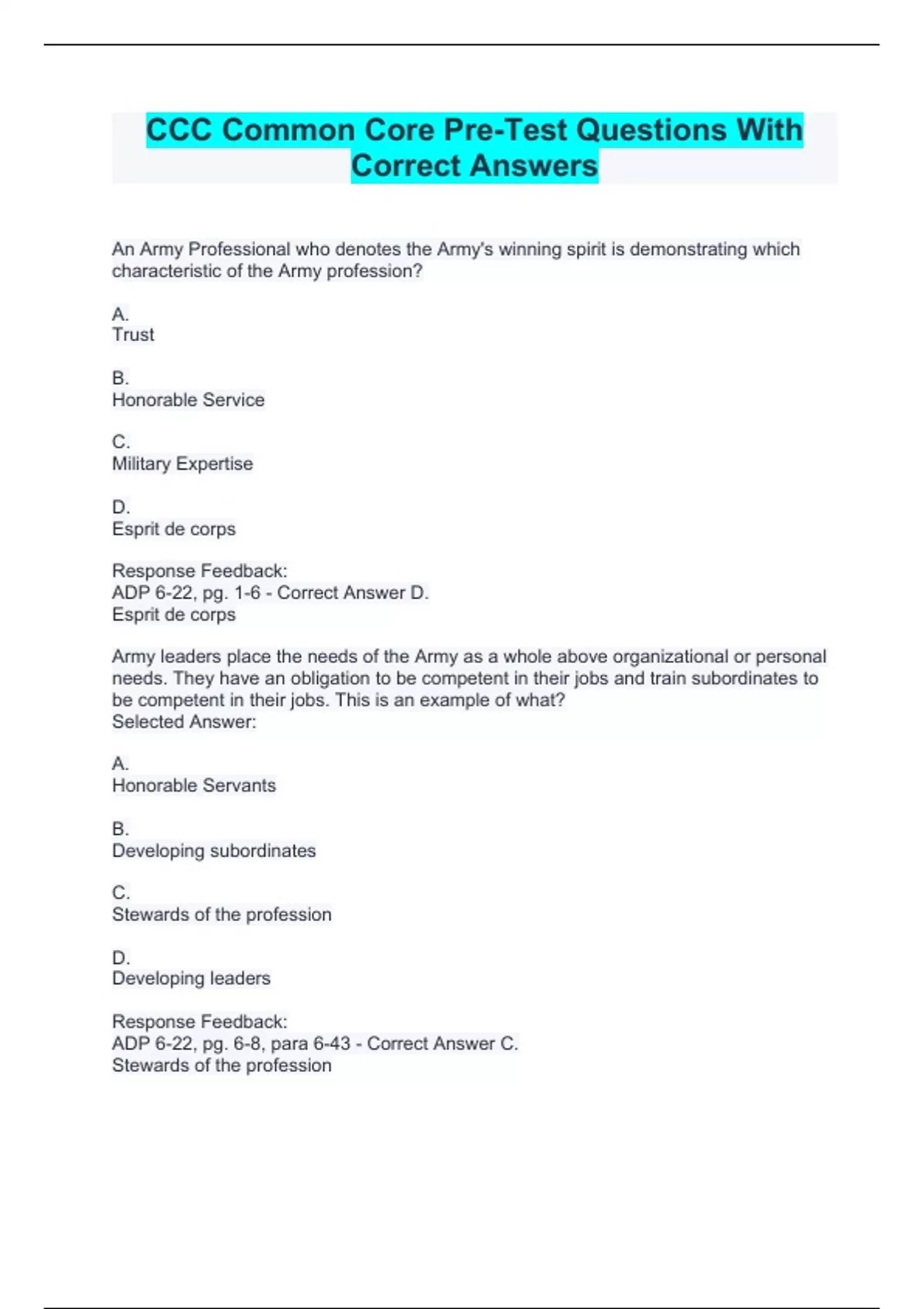 An Army Professional who denotes the Army's winning spirit is demonstrating which characteristic of the Army profession? A. Trust B. Honorable Service C. Military Expertise D. Esprit de corps Response Feedback: ADP 6-22, pg. 1-6 - Correct Answer D. Esprit de corps Army leaders place the needs of the Army as a whole above organizational or personal needs. They have an obligation to be competent in their jobs and train subordinates to be competent in their jobs. This is an example of what? Selected Answer: A. Honorable Servants B. Developing subordinates C. Stewards of the profession D. Developing leaders Response Feedback: ADP 6-22, pg. 6-8, para 6-43 - Correct Answer C. Stewards of the profession A