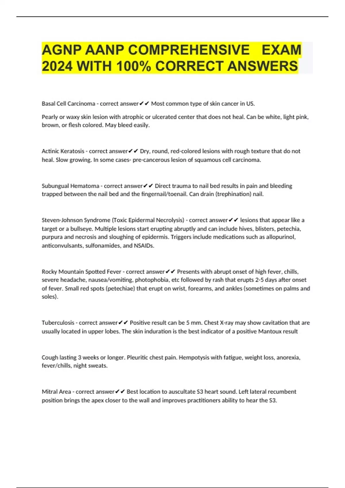 AGNP AANP COMPREHENSIVE EXAM 2024 WITH 100% CORRECT ANSWERS Basal Cell Carcinoma - correct answer Most common type of skin cancer in US. Pearly or waxy skin lesion with atrophic or ulcerated center that does not heal. Can be white, light pink, brown, or flesh colored. May bleed easily. Actinic Keratosis - correct answer Dry, round, red-colored lesions with rough texture that do not heal. Slow growing. In some cases- pre-cancerous lesion of squamous cell carcinoma. Subungual Hematoma - correct answer Direct trauma to nail bed results in pain and bleeding trapped between the nail bed and the fingernail/toenail. Can drain (trephination) nail. Steven-Johnson Syndrome (Toxic Epidermal Necrolysis) - correct answer lesions that appear like a target or a bullseye. Multiple lesions start erupting abruptly and can include hives, blisters, petechia, purpura and necrosis and sloughing of epidermis. Triggers include medications such as allopurinol, anticonvulsants, sulfonamides, and NSAIDs. Rocky Mountain Spotted Fever - correct answer Presents with abrupt onset of high fever, chills, severe headache, nausea/vomiting, photophobia, etc followed by rash that erupts 2-5 days after onset of fever. Small red spots (petechiae) that erupt on wrist, forearms, and ankles (sometimes on palms and soles). Tuberculosis - correct answer Positive result can be 5 mm. Chest X-ray may show cavitation that are usually located in upper lobes. The skin induration is the best indicator of a positive Mantoux result Cough lasting 3 weeks or longer. Pleuritic chest pain. Hempotysis with fatigue, weight loss, anorexia,