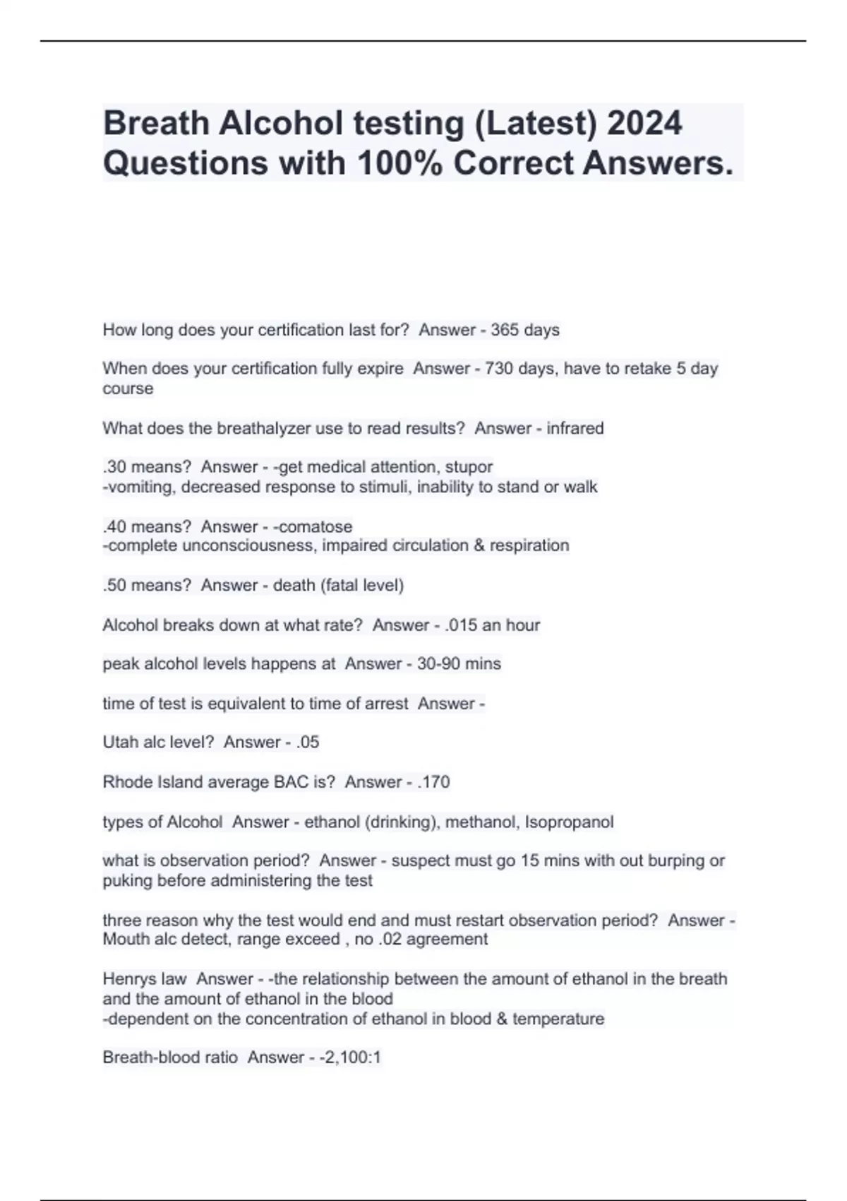 Breath Alcohol testing (Latest) 2024 Questions with 100% Correct Answers.
