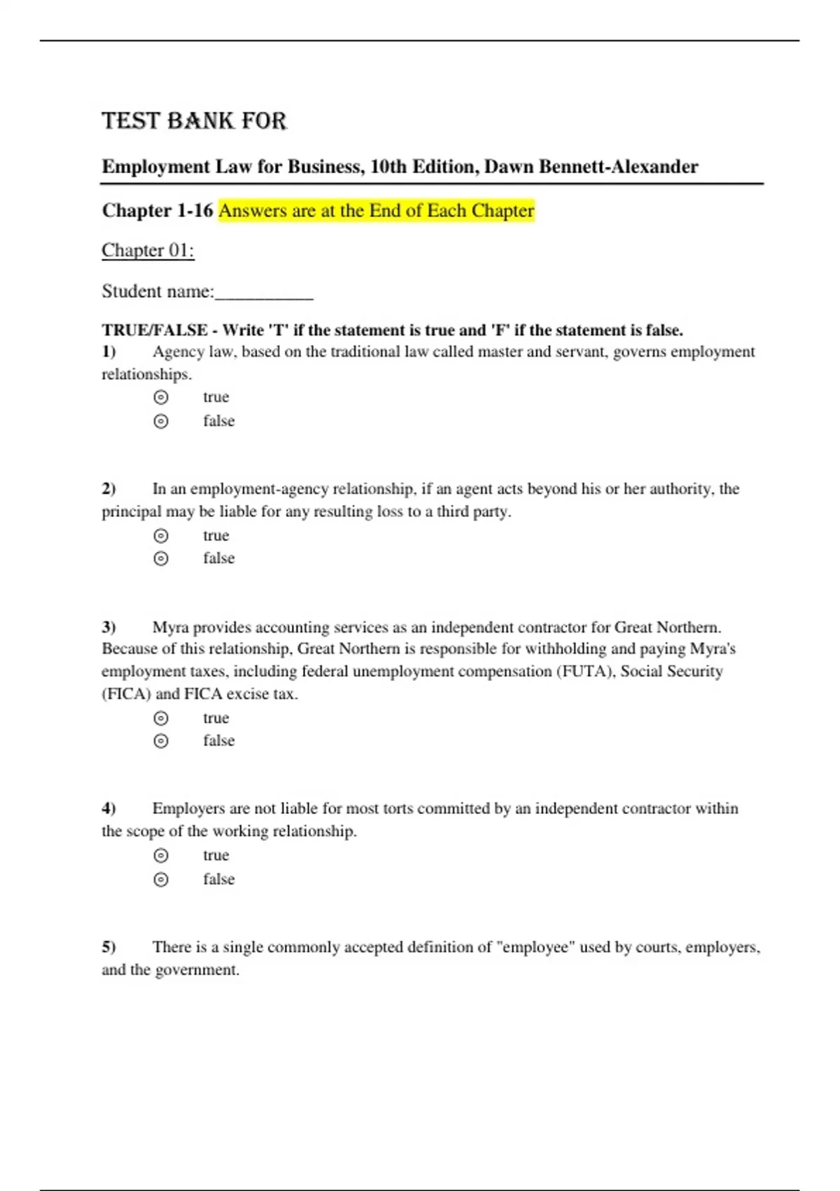 Test Bank For Employment Law for Business, 10th Edition, Dawn Bennett-Alexander. PART ONE: The Regulation of the Employment Relationship. Chapter 1: The Regulation of Employment Chapter 2: The Employment Law Toolkit: Resources for Understanding the Law and Recurring Legal Concepts Chapter 3: Title VII of the Civil Rights Act of 1964 Chapter 4: Legal Construction of the Employment Environment PART TWO: Regulation of Discrimination in Employment Chapter 5: Affirmative Action Chapter 6: Race and Color Discrimination Chapter 7: National Origin Discrimination Chapter 8: Gender Discrimination Chapter 9: Sexual Harassment Chapter 10: Sexual Orientation and Gender Identity Discrimination Chapter 11: Religious Discrimination Chapter 12: Age Discrimination Chapter 13: Disability Discrimination PART THREE: Regulation of the Employment Environment Chapter 14: The Employee’s Right to Privacy and Management of Personal Information Chapter 15: Labor Law Chapter 16: Selected Employment Benefits and Protections