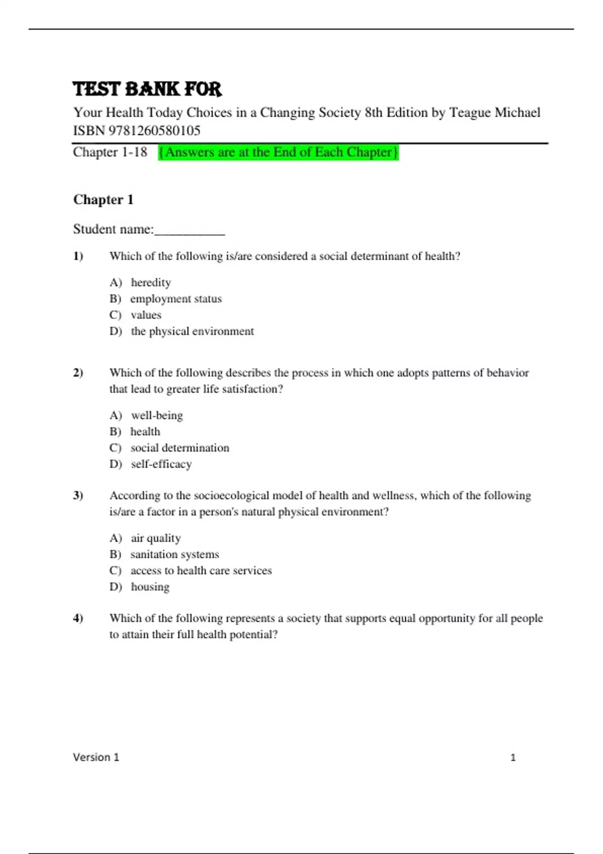 Test Bank for Your Health Today: Choices in a Changing Society 8th Edition by Michael Teague, Sara Mackenzie, David Rosenthal. CHAPTER 1 Self, Family, and Community CHAPTER 2 Mental Health and Stress CHAPTER 3 Social Connections CHAPTER 4 Sleep CHAPTER 5 Nutrition CHAPTER 6 Fitness CHAPTER 7 Body Weight and Body Composition CHAPTER 8 Body Image CHAPTER 9 Alcohol and Tobacco CHAPTER 10 Drugs CHAPTER 11 Sexual Health CHAPTER 12 Reproductive Choices CHAPTER 13 Infectious Diseases CHAPTER 14 Cardiovascular Disease, Diabetes, Chronic Lung Diseases, and Dementia CHAPTER 15 Cancer CHAPTER 16 Injury and Violence CHAPTER 17 Complementary and Integrative Medicine CHAPTER 18 Environmental Issues