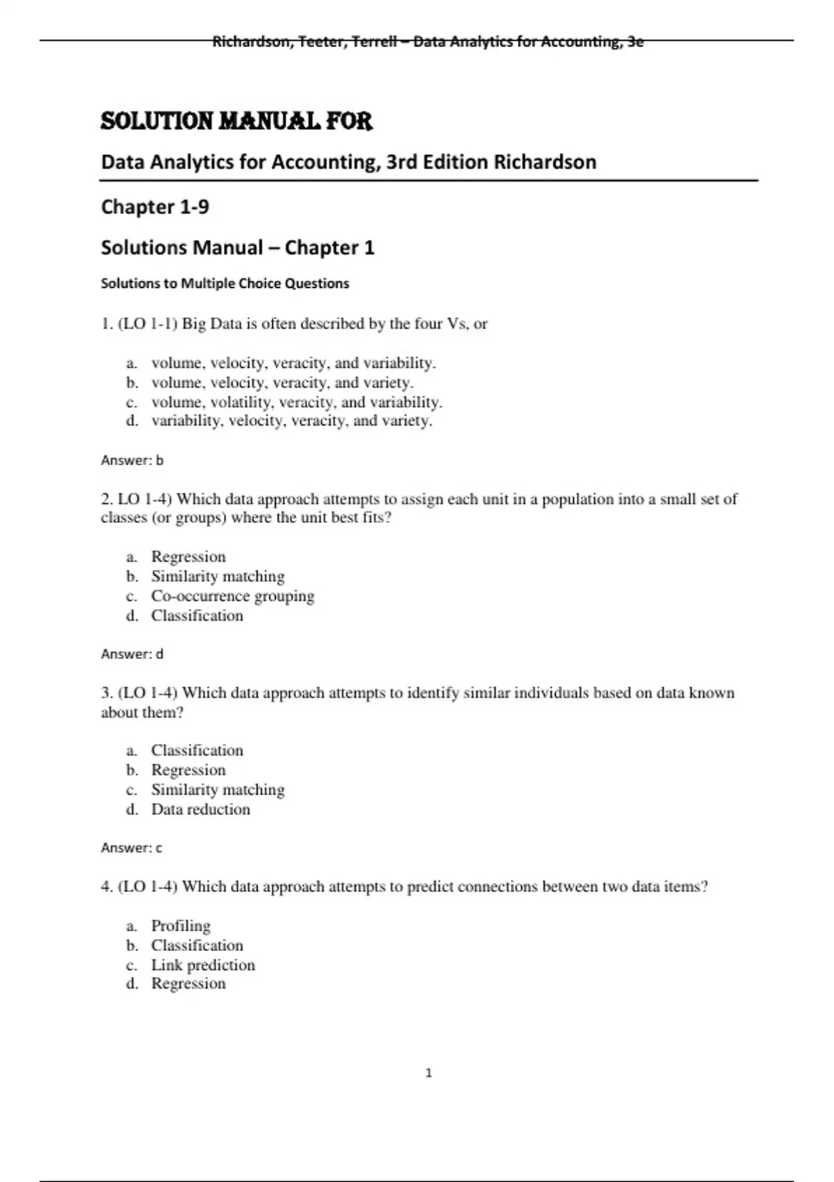 Solution Manual For Data Analytics for Accounting, 3rd Edition by Vernon Richardson, Ryan Teeter and Katie Terrell. Chapter 1: Data Analytics for Accounting and Identifying the Questions Chapter 2: Mastering the Data Chapter 3: Performing the Test Plan and Analyzing the Results Chapter 4: Communicating Results and Visualizations Chapter 5: The Modern Accounting Environment Chapter 6: Audit Data Analytics Chapter 7: Managerial Analytics Chapter 8: Financial Statement Analytics Chapter 9: Tax Analytics Chapter 10: Project Chapter (Basic) Chapter 11: Project Chapter (Advanced): Analyzing Dillard’s Data to Predict Sales Returns