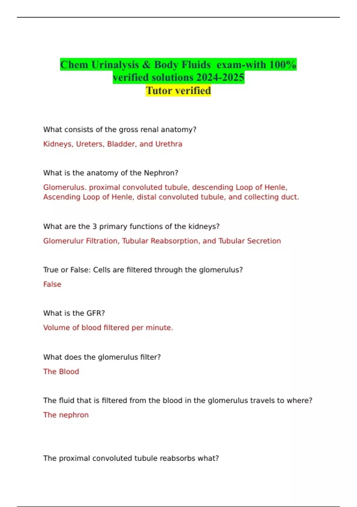 Chem Urinalysis & Body Fluids exam-with 100% verified solutions