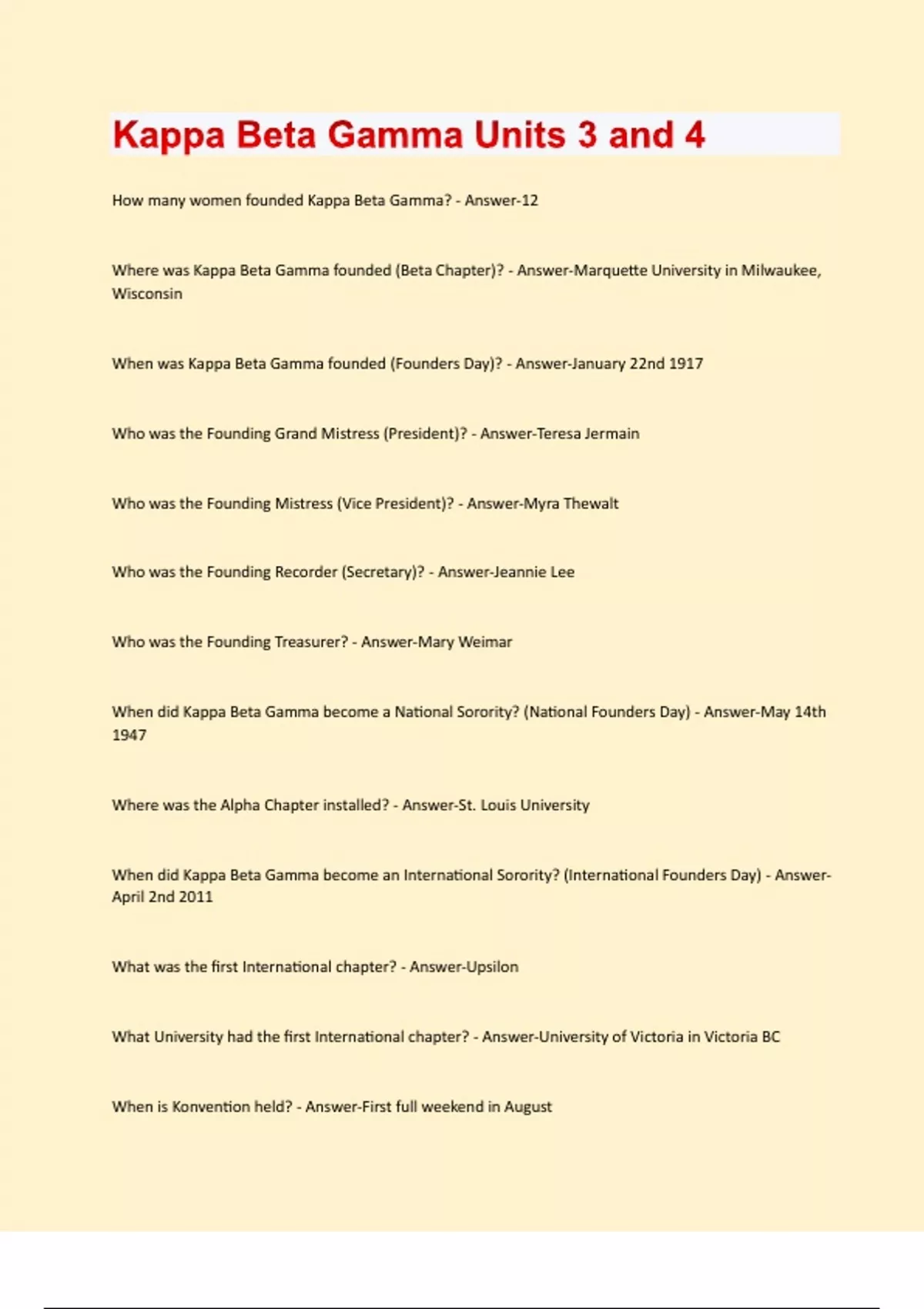 How many women founded Kappa Beta Gamma? - Answer-12 Where was Kappa Beta Gamma founded (Beta Chapter)? - Answer-Marquette University in Milwaukee, Wisconsin When was Kappa Beta Gamma founded (Founders Day)? - Answer-January 22nd 1917 Who was the Founding Grand Mistress (President)? - Answer-Teresa Jermain Who was the Founding Mistress (Vice President)? - Answer-Myra Thewalt Who was the Founding Recorder (Secretary)? - Answer-Jeannie Lee Who was the Founding Treasurer? - Answer-Mary Weimar When did Kappa Beta Gamma become a National Sorority? (National Founders Day) - Answer-May 14th 1947 Where was the Alpha Chapter installed? - Answer-St. Louis University When did Kappa Beta Gamma become an International Sorority? (International Founders Day) - AnswerApril 2nd 2011 What was the first International chapter? - Answer-Upsilon What University had the first International chapter? - Answer-University of Victoria in Victoria BC When is Konvention held? - Answer-First full weekend in AugustWho is the CEO/President of the Grand Council? - Answer-Destiny Perez Who is the COO/Vice President of the Grand Council? - Answer-Katie Minaghan Who is the CFO/Treasurer of the Grand Council? - Answer-Allyson Simerlein Who is the Operations Coordinator on the National Active Board? - Answer-N/A Who is the Compliance Coordinator on the National Active Board? - Answer-N/A Who is the Membership Development Coordinator on the National Active Board? - Answer-N/A Who is the Public Relations Coordinator on the National Active Board? - Answer-N/A Who is the President of your Chapter? - AnswerWho is the Vice President of your Chapter? - AnswerWho is the Treasurer of your Chapter? - AnswerWho is the Secretary of your Chapter? - AnswerWho is the New Member Educator of your Chapter? - AnswerWhat is the Kappa Beta Gamma Motto? - Answer-Character, Culture, Courage What is Kappa Beta Gamma's vision/purpose? - Answer-To improve its members morally, socially, and intellectually.What is the International Philanthropy? - Answer-Special Olympics What is the local philanthropy? - AnswerWhat is the International Token Award? - Answer-A Pageant Sash Why is the International Token Award a Pageant Sash? - Answer-To honor our Founding Sisters' history as Pageant Women What are the Kappa Beta Gamma Jewels? - Answer-Blue Sapphires and White Pearls What are the Kappa Beta Gamma Colors? - Answer-Deep Sapphire, Pearl White, and Old Gold What is the Kappa Beta Gamma Mascot? - Answer-Jermain the lion