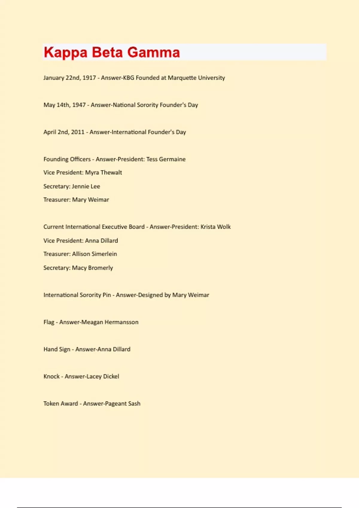 January 22nd, 1917 - Answer-KBG Founded at Marquette University May 14th, 1947 - Answer-National Sorority Founder's Day April 2nd, 2011 - Answer-International Founder's Day Founding Officers - Answer-President: Tess Germaine Vice President: Myra Thewalt Secretary: Jennie Lee Treasurer: Mary Weimar Current International Executive Board - Answer-President: Krista Wolk Vice President: Anna Dillard Treasurer: Allison Simerlein Secretary: Macy Bromerly International Sorority Pin - Answer-Designed by Mary Weimar Flag - Answer-Meagan Hermansson Hand Sign - Answer-Anna Dillard Knock - Answer-Lacey Dickel Token Award - Answer-Pageant SashFlower - Answer-Forget me not Colors - Answer-Blue and Gold Mascot - Answer-Jermain the Lion 7 statuses of membership - Answer-Active Inactive Chapter/International Alumnae Association Members Honorary Members New Member Candidate Disaffiliated Membership Poor status/Poor academic status membership 5 Points of the Star - Answer-Sisterhood-unity Fidelity- purposes and rules Love & Faith- two pillars the sorority was founded upon Charity- willingness Loyalty-cooperation National Philanthropy - Answer-Special Olympics Connecticut Humane Society KBG Chapters (17) - Answer-1. Delta Chapter- University of Detroit Mercy- Detroit, MI 2. Theta Chapter- St. Norbert College-DePere, WI 3. Kappa Chapter- Marian University- Fond du Lac, WI 4. Lambda Chapter- Northern Michigan University- Marquette, MI 5. Xi Chapter- Frostburg State University- Frostburg, MD 6. Omicron Chapter- Shippensburg University- Shippensburg, PA7. Pi Chapter- Keene State College- Keene, NH 8. Rho Chapter- Caldwell College- Caldwell, NJ 9. Tau Chapter- University of Minnesota Duluth- Duluth, MN 10. Sigma Chapter- Wake Forest University- Winston Salem, NC 11. Phi Chapter- Penn State Harrisburg- Middletown, PA 12. Chi Chapter- Brandeis University- Waltham, MA 13. Upsilon Chapter- University of Victoria- Victoria, Canada 14. Psi Chapter- Georgia Gwinnett College- Lawrenceville, Georgia 15. Alpha Alpha Chapter- Trine University- Angola, Indiana 16. Alpha Beta Chapter- University of Connecticut- Storrs, CT 17. Alpha Gamma Chapter- Simon Fraser University- Burnaby, Canada Founding Sisters of Alpha Beta Chapter - Answer-Laurelle Giovannoli- President Laura Hatchman- Vice President Chelsey Kovacs- National Liaison Lauren Baxter- Treasurer Jocelyn Claudio- Treasurer Ornela Minxhozi Mackenzie Slane Executive Board - Answer-President Vice President National Liaison Treasurer Secretary Non Executive Board - Answer-New Member Educator Hike Leader Star GuideRecruitment Chair Publicity Chair Fundraising Chair Social Chair Philanthropy Chair Sisterhood Chair Academic Chair Standards Chair Merchandising Chair Historian Chapter Alumnae Liaison Base - Answer-Upholding the shield is the sorority pin Scroll - Answer-Sorority's motto: Character. Culture. Courage