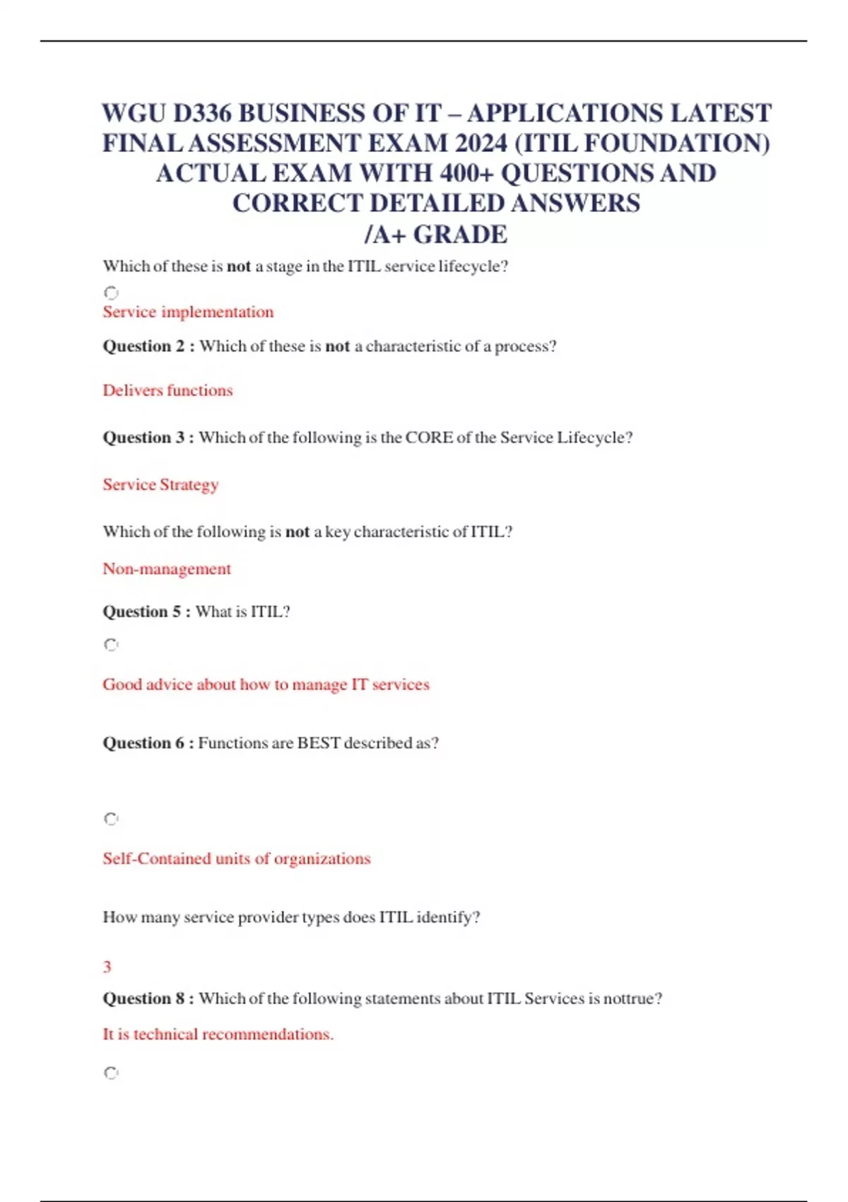 WGU D336 BUSINESS OF IT – APPLICATIONS LATEST FINAL ASSESSMENT EXAM 2024 (ITIL FOUNDATION) ACTUAL EXAM WITH 400+ QUESTIONS AND CORRECT DETAILED ANSWERS /A+ GRADE