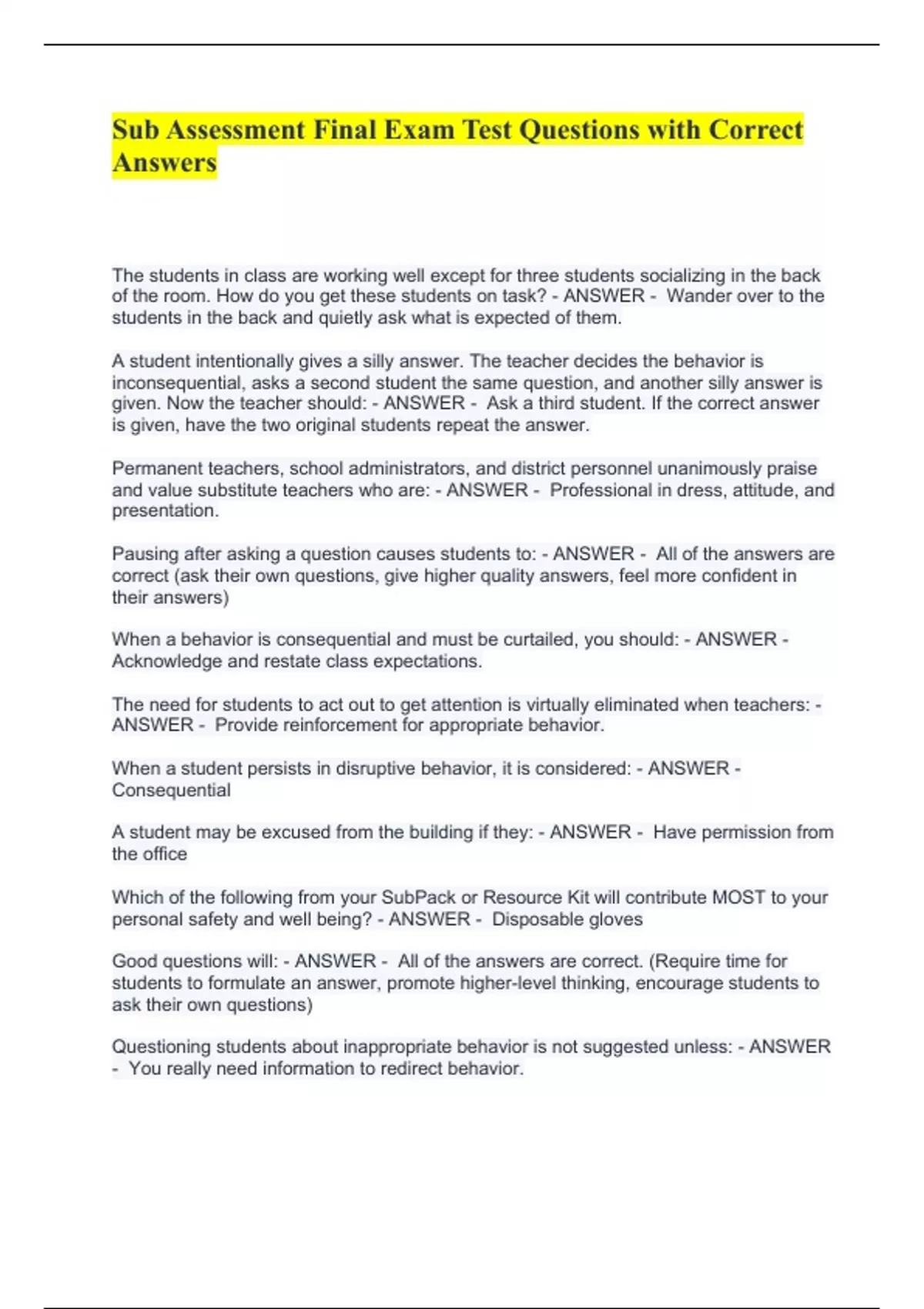 Sub Assessment Final Exam Test Questions with Correct Answers The students in class are working well except for three students socializing in the back of the room. How do you get these students on task? - ANSWER - Wander over to the students in the back and quietly ask what is expected of them.
