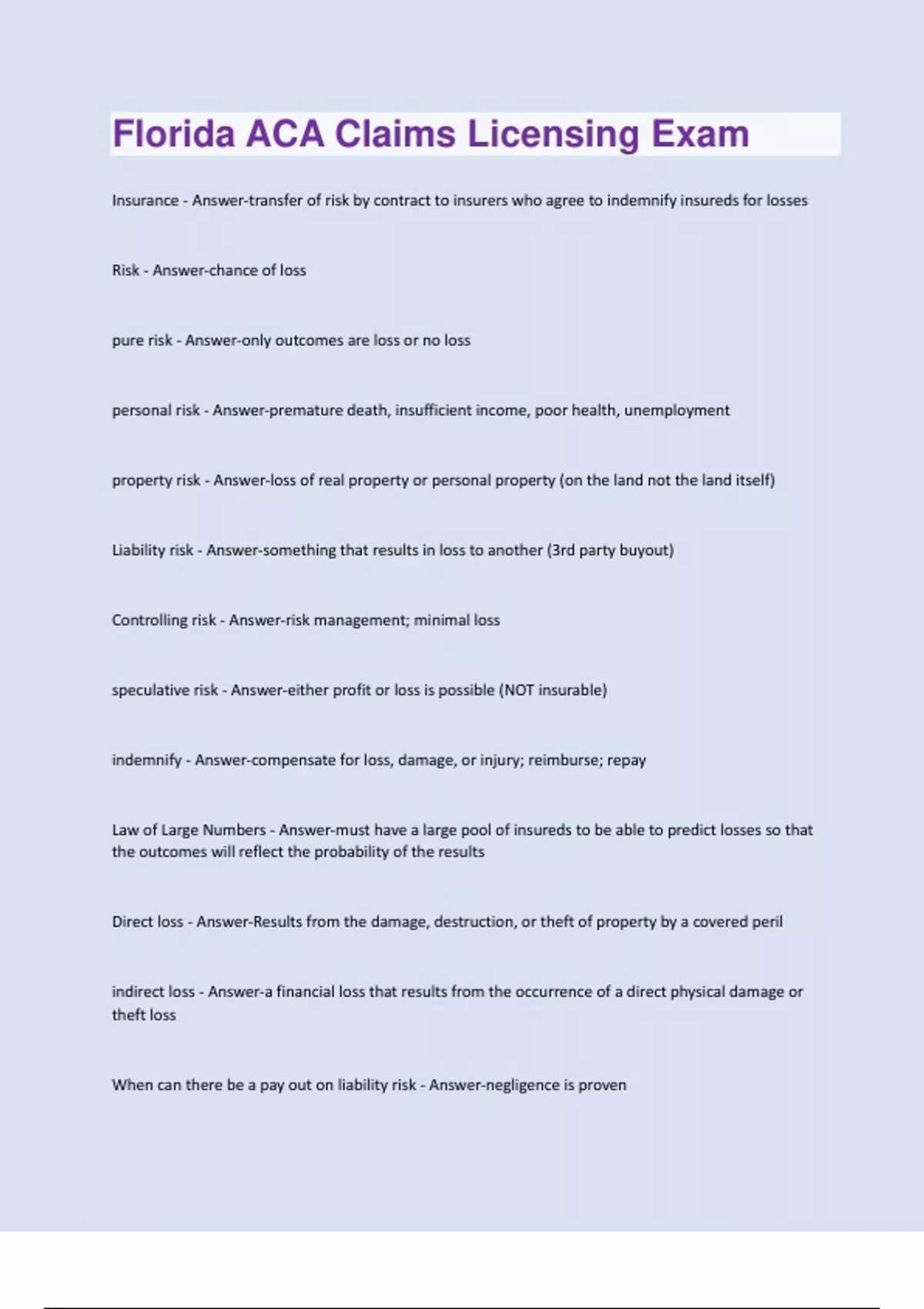 Insurance - Answer-transfer of risk by contract to insurers who agree to indemnify insureds for losses Risk - Answer-chance of loss pure risk - Answer-only outcomes are loss or no loss personal risk - Answer-premature death, insufficient income, poor health, unemployment property risk - Answer-loss of real property or personal property (on the land not the land itself) Liability risk - Answer-something that results in loss to another (3rd party buyout) Controlling risk - Answer-risk management; minimal loss speculative risk - Answer-either profit or loss is possible (NOT insurable) indemnify - Answer-compensate for loss, damage, or injury; reimburse; repay Law of Large Numbers - Answer-must have a large pool of insureds to be able to predict losses so that the outcomes will reflect the probability of the results Direct loss - Answer-Results from the damage, destruction, or theft of property by a covered peril indirect loss - Answer-a financial loss that results from the occurrence of a direct physical damage or theft loss When can there be a pay out on liability risk - Answer-negligence is provennegligence - Answer-failure to use due care; otherwise known as the prudent person rule Strict or Absolute Liability - Answer-Liability assigned by statute without regard for negligence (set by the state or industry, no allowable defense) Indemnity Principle - Answer-one should be in approximately the same position after a loss as he was before the loss Insurer - Answer-A person or company that underwrites an insurance risk; the party in an insurance contract undertaking to pay compensation. Insured - Answer-one who is named or covered by insurance Insurable interest - Answer-must exist at the time of loss and usually means an economic or other interest in the event or in a particular property ex: bank loans or mortgage companies What is the measure of insurable interest - Answer-the extent to which the insured might be damnified by loss, injury, or impairment thereof Policy - Answer-a written document containing coverage, exclusions, conditions and endorsements Binder - Answer-can be oral or written and places the insurance "in effect" Requirements of a valid contract - Answer-consent of all parties (offer and acceptance), valuable consideration (monetary exchange), all parties must be of legal capacity (competent), and it must be for legal purposes to be enforceable Characteristics of an insurance contract - Answer-personal, conditional, contract of adhesion (gray area, will side on the behalf of the insured), principle of indemnity, aleatory (exchange is not equal), unilateral (payment for a promise)Domestic insurance company - Answer-A company that resides and is incorporated under the laws of the state in which it is operating Foreign Insurance Company - Answer-An insurance company that is incorporated outside the state where it is conducting business