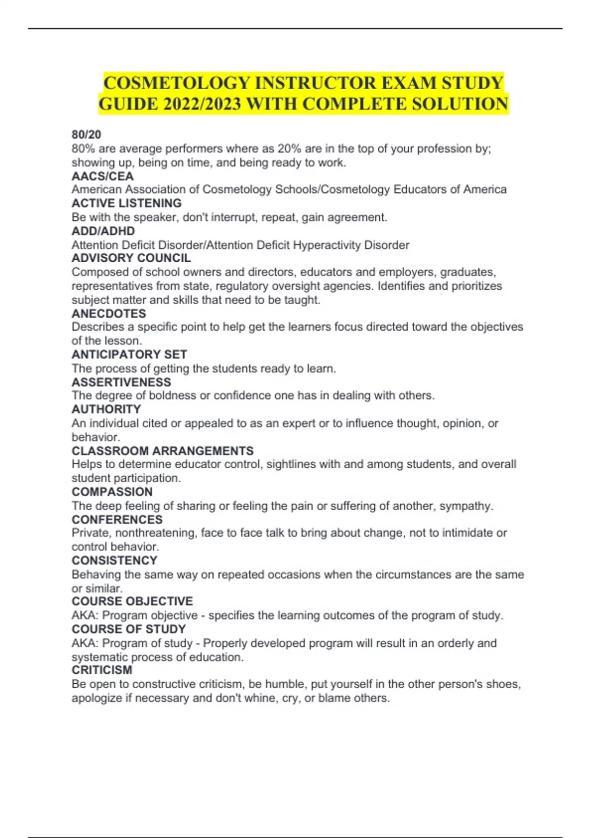 COSMETOLOGY INSTRUCTOR EXAM STUDY GUIDE 2022/2023 WITH COMPLETE SOLUTION 80/20 80% are average performers where as 20% are in the top of your profession by; showing up, being on time, and being ready to work. AACS/CEA American Association of Cosmetology Schools/Cosmetology Educators of America ACTIVE LISTENING Be with the speaker, don't interrupt, repeat, gain agreement. ADD/ADHD Attention Deficit Disorder/Attention Deficit Hyperactivity Disorder ADVISORY COUNCIL Composed of school owners and directors, educators and employers, graduates, representatives from state, regulatory oversight agencies. Identifies and prioritizes subject matter and skills that need to be taught. ANECDOTES Describes a specific point to help get the learners focus directed toward the objectives of the lesson. ANTICIPATORY SET The process of getting the students ready to learn. ASSERTIVENESS The degree of boldness or confidence one has in dealing with others. AUTHORITY An individual cited or appealed to as an expert or to influence thought, opinion, or behavior. CLASSROOM ARRANGEMENTS Helps to determine educator control, sightlines with and among students, and overall student participation. COMPASSION The deep feeling of sharing or feeling the pain or suffering of another, sympathy. CONFERENCES Private, nonthreatening, face to face talk to bring about change, not to intimidate or control behavior. CONSISTENCY Behaving the same way on repeated occasions when the circumstances are the same or similar. COURSE OBJECTIVE AKA: Program objective - specifies the learning outcomes of the program of study. COURSE OF STUDY AKA: Program of study - Properly developed program will result in an orderly and systematic process of education. CRITICISM Be open to constructive criticism, be humble, put yourself in the other person's shoes, apologize if necessary and don't whine, cry, or blame others. CURRICULUM DEVELOPMENT The process of developing a set of courses constituting an area of specialization as prescribed by the state regulatory agency. DEDUCTIVE REASONING The process of reaching a probable conclusion by employing logical reasoning. DEMOGRAPHICS Average income, cost of services, age, ethnicity, etc. within a specified area. DEMONSTRATION Perform at an appropriate speed ensuring the students do not miss any key points or steps. DEPT. OF EDUCATION Sets forth specific regulations governing student hours and financial aid disbursement. DISABLED LEARNER Is responsible for providing documentation of their disability and making a formal request for accommodations. DYSLEXIA A specific learning disability that is an impairment in the brain's ability to translate written images received by the eyes into meaningful language. ELIGIBLE STUDENT A student above the age of 18 enrolled in a post secondary school. ENERGIZER An activity lasting one to three minutes to provide for a physical or mental break to bring new life into the class. ENTHUSIASM Goes hand in hand with energy. ETHICAL STANDARDS Educators should model and teach these daily in their interactions with students. EVENTS Basic elements of time; key to managing time is controlling these. EXTERNAL MOTIVATORS Examples are; pep talks, incentives, exciting presentations, guest speakers, etc. INTERNAL MOTIVATORS Your inner drive that keeps you moving toward your goals. EYE CONTACT A low-profile intervention that requires little effort on the part of the educator for controlling a minor misconduct. FACILITATE To bring about learning. FATIGUE The medical profession has agreed in large part, that this is of mental origin rather than a result of a physical ailment. FERPA Family Educational Right to Privacy Act FIELD TRIPS Provide students with an opportunity for active learning and a broader real world experience.