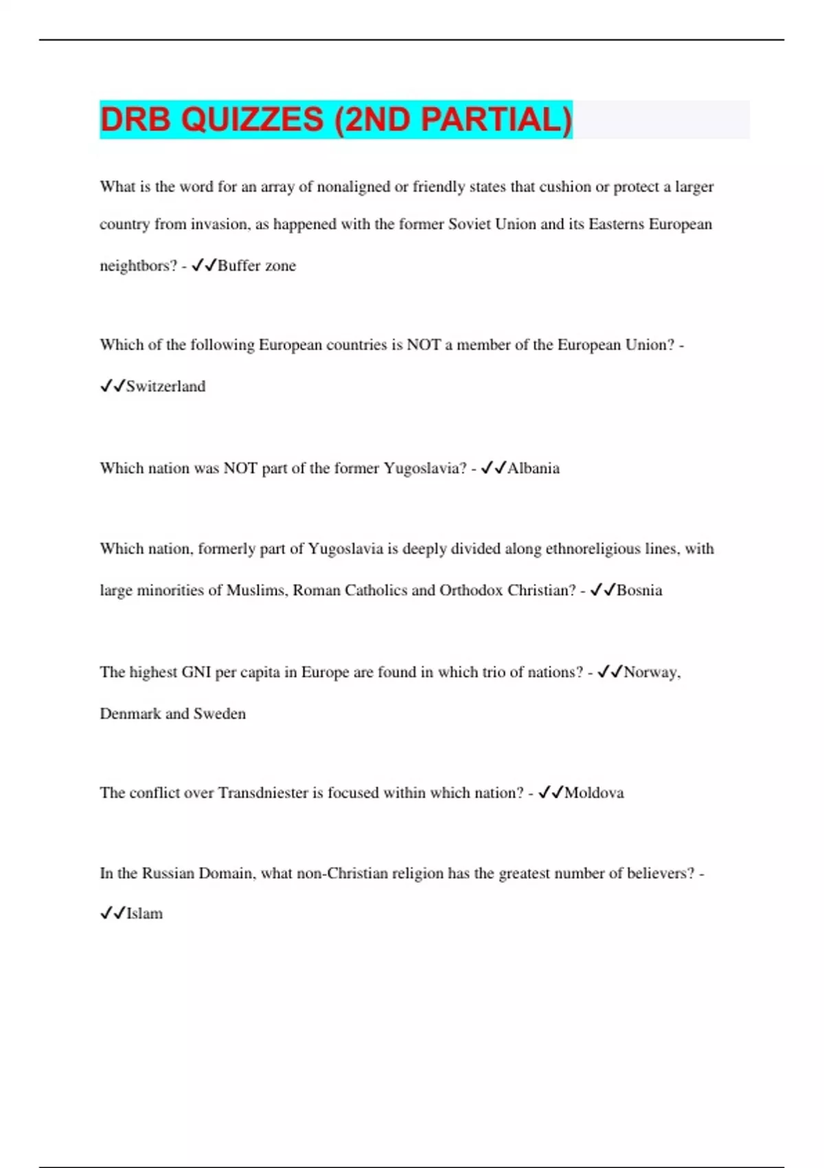 DRB QUIZZES (2ND PARTIAL) What is the word for an array of nonaligned or friendly states that cushion or protect a larger country from invasion, as happened with the former Soviet Union and its Easterns European neightbors? - Buffer zone Which of the following European countries is NOT a member of the European Union? - Switzerland Which nation was NOT part of the former Yugoslavia? - Albania Which nation, formerly part of Yugoslavia is deeply divided along ethnoreligious lines, with large minorities of Muslims, Roman Catholics and Orthodox Christian? - Bosnia The highest GNI per capita in Europe are found in which trio of nations? - Norway, Denmark and Sweden The conflict over Transdniester is focused within which nation? - Moldova In the Russian Domain, what non-Christian religion has the greatest number of believers? - Islam What language is most frequently spoken within Moldova? - Romanian The majority of the population of Crimea - Is russian and want to accept russian annexation Today in Russia a total of ______ people control 35% of Russian's wealth. - 110 The primary destination for Russia's petroleum exports is currently - Western europe The Russian language uses which alphabet? - Cryilic The Russian currency instrument is know as the - Ruble Russia forcibly annexed which peninsular part of Ukraine in 2014? - Crimea What has become of democracy in Russia in the post-Soviet era? - Once a flowering democrracy - has turned more and more to a centrally controlled and censoring government What is perestroika? - Restructuring of the planned What percent of Russia's farmland had been provatized by 2003? - 90% Which of the following is a Salavic language? - Ukrainian What is glasnost? - A URSS openness Which of the following is NOT a current economic challenge facing Russia? - The climate has made Russia to import lots of food Approximately what percentage of Russian citizens claim a Russian linguistic identity? - 80% Which of the following EU member states does