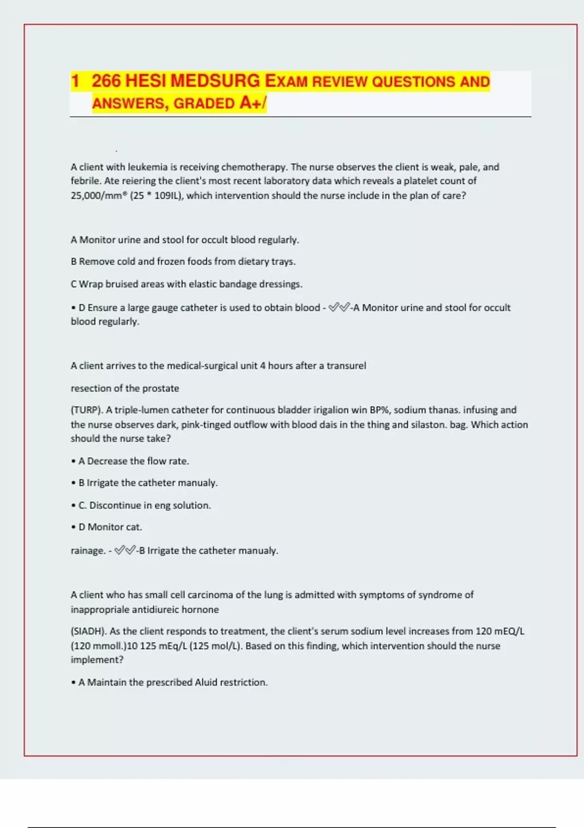 266 HESI MEDSURG EXAM REVIEW QUESTIONS AND ANSWERS, GRADED A+/ A client with leukemia is receiving chemotherapy. The nurse observes the client is weak, pale, and febrile. Ate reiering the client's most recent laboratory data which reveals a platelet count of 25,000/mm® (25 * 109IL), which intervention should the nurse include in the plan of care? A Monitor urine and stool for occult blood regularly. B Remove cold and frozen foods from dietary trays. C Wrap bruised areas with elastic bandage dressings. • D Ensure a large gauge catheter is used to obtain blood - -A Monitor urine and stool for occult blood regularly. A client arrives to the medical-surgical unit 4 hours after a transurel resection of the prostate (TURP). A triple-lumen catheter for continuous bladder irigalion win BP%, sodium thanas. infusing and the nurse observes dark, pink-tinged outflow with blood dais in the thing and silaston. bag. Which action should the nurse take? • A Decrease the flow rate. • B Irrigate the catheter manualy. • C. Discontinue in eng solution. • D Monitor cat. rainage. - -B Irrigate the catheter manualy. A client who has small cell carcinoma of the lung is admitted with symptoms of syndrome of inappropriale antidiureic hornone (SIADH). As the client responds to treatment, the client's serum sodium level increases from 120 mEQ/L (120 mmoll.)10 125 mEq/L (125 mol/L). Based on this finding, which intervention should the nurse implement? • A Maintain the prescribed Aluid restriction. • B Increase neurologic checks to every 2 hours. • C Withhold next scheduled dose of treatment. • D Assess for increasing fluid volume overload. - -A Maintain the prescribed Aluid restriction. The nurse is caring for a client with chronic pancreatitis who reports persistent gnawing abdominal pain. Tohapline client manage the pain, which assessment data is most important for the nurse to obiain? A Activity level of bowel sounds. B Level and amount of physical activity. C Color and consistency of feces. D Eating patterns of dietary intake. - -D Eating patterns of dietary intake. A client that is obese, has emphysema, and who smokes at least a pack of cigarettes dally is admitted after emperieningsiden increase in dyspnea and activity intolerance. Oxygen therapy is initiated and it is determined that the dient will be discharged with oxygen. Which information is most important for the nurse to emphasize in the discharge teaching dhan?. A Approaches to conserve energ