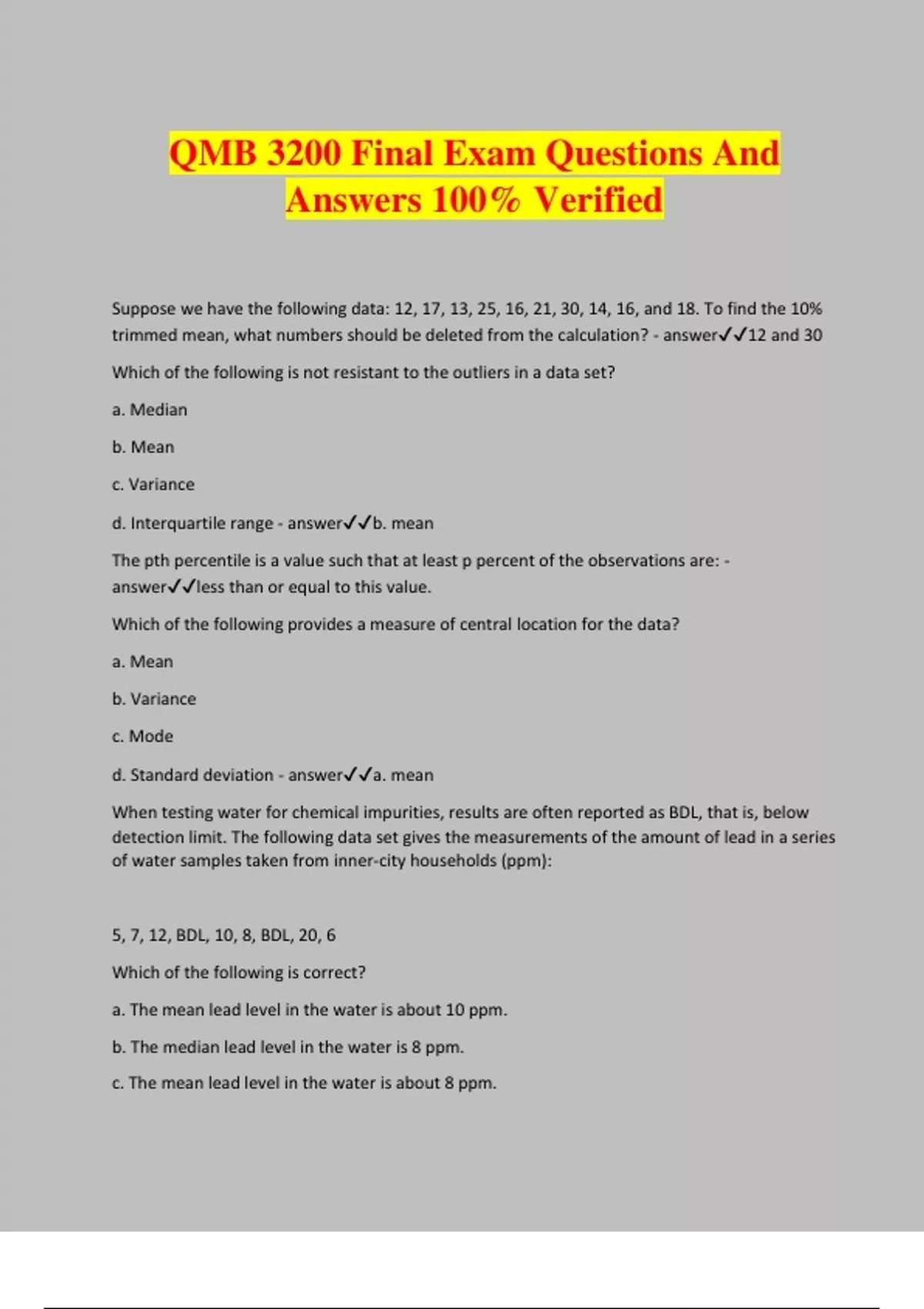 QMB 3200 Final Exam Questions And Answers 100% Verified Suppose we have the following data: 12, 17, 13, 25, 16, 21, 30, 14, 16, and 18. To find the 10% trimmed mean, what numbers should be deleted from the calculation? - answer12 and 30 Which of the following is not resistant to the outliers in a data set? a. Median b. Mean c. Variance d. Interquartile range - answerb. mean The pth percentile is a value such that at least p percent of the observations are: - answerless than or equal to this value. Which of the following provides a measure of central location for the data? a. Mean b. Variance c. Mode d. Standard deviation - answera. mean When testing water for chemical impurities, results are often reported as BDL, that is, below detection limit. The following data set gives the measurements of the amount of lead in a series of water samples taken from inner-city households (ppm): 5, 7, 12, BDL, 10, 8, BDL, 20, 6 Which of the following is correct? a. The mean lead level in the water is about 10 ppm. b. The median lead level in the water is 8 ppm. c. The mean lead level in the water is about 8 ppm. d. The median lead level in the water is 7 ppm. - answerd. The median lead level in the water is 7 ppm. A student made scores of 85, 56, and 91 on her first three statistics tests. What score does she need to make on her next test to have an 80 test average? - answer88 Growth factors for the population of Dallas in the past five years have been 1, 2, 3, 4, and 5, respectively. The geometric mean is: - answer^5square root 120 A sample of 99 distances has a mean of 24 feet and a median of 21.5 feet. Unfortunately, it has just been discovered that an observation that was erroneously recorded as "30" actually had a value of "35." If we make this correction to the data, then: - answerthe median remains the same, but the mean is increased. A numerical value used as a summary measure for a sample, such as sample mean, is known as a: - answersample statistic. The measure of location that is most likely to be influenced by extreme values in a data set is the: - answermean A student was performing an experiment that compared a new high protein food to the old food for pigs. He found the mean weight gain for subjects consuming the new food to be 12.8 pounds with a standard deviation of 3.5 pounds. Later, he realized that the scale was out of calibration by 1.5 pounds (meaning that the scale weighed items 1.5 pounds more). What should be the summary measures, mean and standard deviation, for the subjects consuming the new food? - answerThe mean should be 11.3 and the standard deviation should remain unchanged. When a set of data has suspect outliers, which of the following is the referred measure of central tendency? - answermedian In a sample of 500 students whose mean height is 67.8 inches, 150 were women. If the mean height of the women was 63.0 inches, what is the mean height of the men in the sample? - answer69.9 The coefficient of variation formula - answerthe standard deviation divided by the mean and multiplied by 100. The summary statistics for the hourly wages of a sample of 130 system analysts are given below: Mean = 60 Range = 20