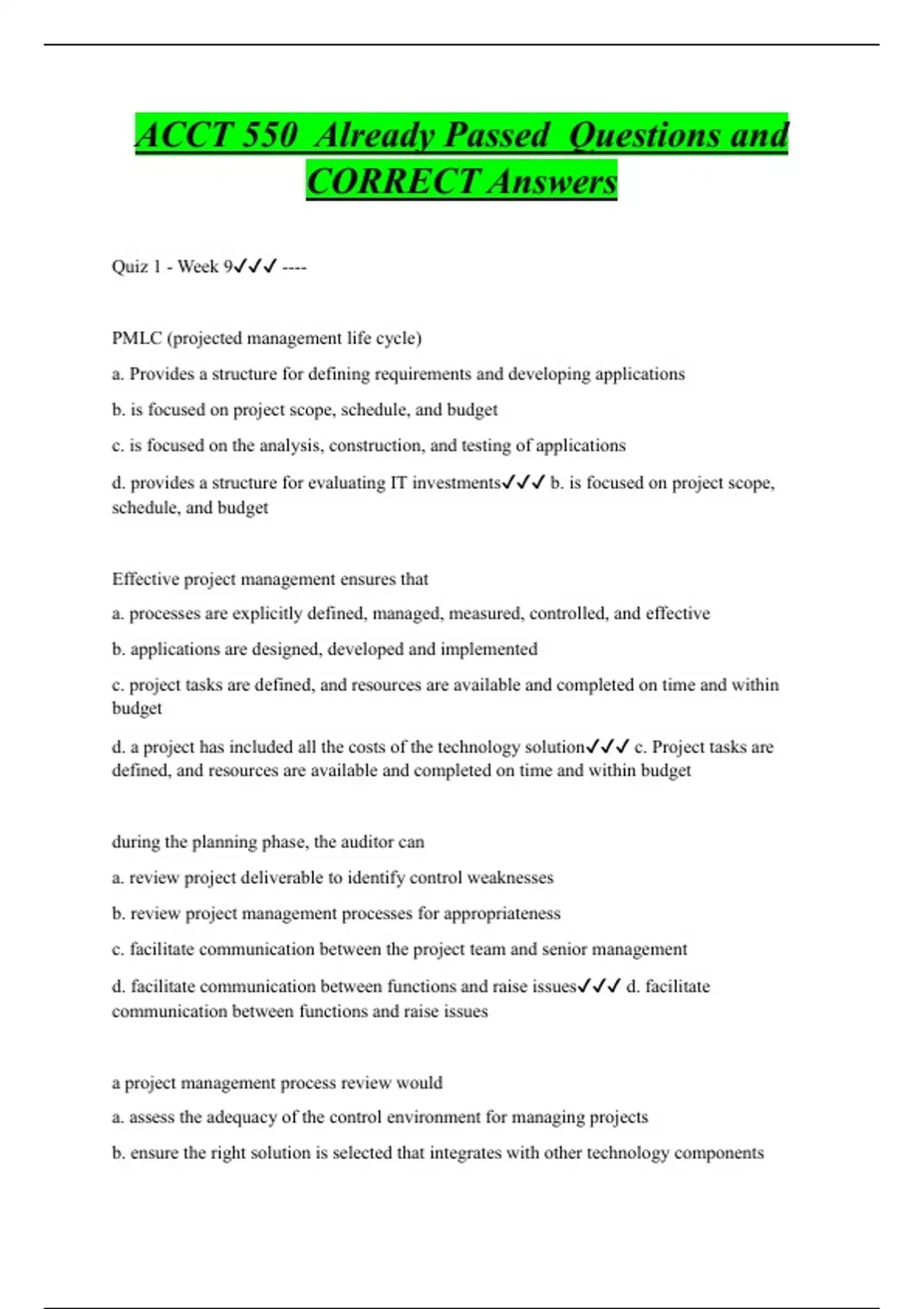 Quiz 1 - Week 9 ---- PMLC (projected management life cycle) a. Provides a structure for defining requirements and developing applications b. is focused on project scope, schedule, and budget c. is focused on the analysis, construction, and testing of applications d. provides a structure for evaluating IT investments b. is focused on project scope, schedule, and budget