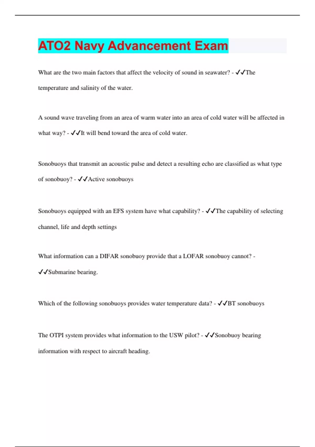 ATO2 Navy Advancement Exam What are the two main factors that affect the velocity of sound in seawater? - The temperature and salinity of the water. A sound wave traveling from an area of warm water into an area of cold water will be affected in what way? - It will bend toward the area of cold water. Sonobuoys that transmit an acoustic pulse and detect a resulting echo are classified as what type of sonobuoy? - Active sonobuoys Sonobuoys equipped with an EFS system have what capability? - The capability of selecting channel, life and depth settings What information can a DIFAR sonobuoy provide that a LOFAR sonobuoy cannot? - Submarine bearing. Which of the following sonobuoys provides water temperature data? - BT sonobuoys The OTPI system provides what information to the USW pilot? - Sonobuoy bearing information with respect to aircraft heading. What type of naval aircraft employs the AN/ASQ-13F dipping sonar system? - SH60-F On a dipping sonar system, what component generates and transmits sound energy into the water? - The transducer. What does the acronym IFF stands for? - Identification Friend or Foe What are the three basic steps in the identification process of a typical IFF system? - Challenge, decode, and reply True or False. All naval aircraft contain an interrogator system. - False What is the pulse spacing of Mode 1? - 2.9 to 3.1 microseconds Of the six modes of IFF operation, which one is used by military and civilian aircraft control stations? - Mode 3/A What mode IFF is the military encrypted mode? - Mode 4 What is the transmission frequency of the interrogator? - 1030MHz In a typical IFF/SIF system, what total number of codes can be selected in Mode 2? - 4096 The Identification of Position (I/P) pulse is used for what purpose? - It is used to identify a specific friendly aircraft among other friendly aircraft that reply with the same code. What mode of IFF is set prior to takeoff by maintenance personnel? - Mode 2 Where are Modes 1 and 3/A selected on the AN/APX-72 transponder set? - By thumbwheel switches on the front of the control box. What part of the APX-72 system provides for ground or in-flight transponder testing capability? - The Transponder Test Set TS-1843/APX