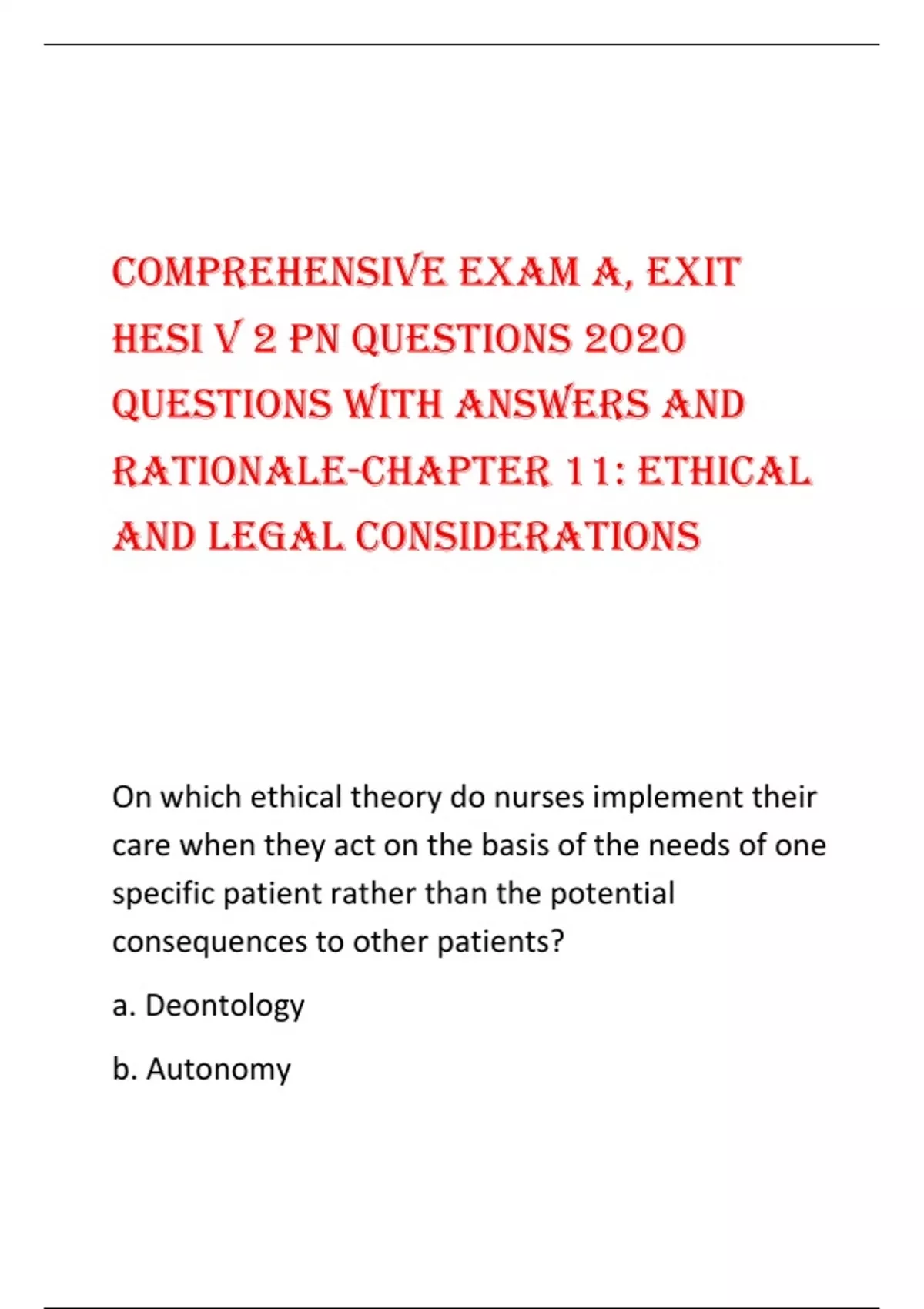 Comprehensive Exam A, EXIT HESI v 2 PN Questions 2020 questions with answers and rationale-Chapter 11: Ethical and Legal Considerations