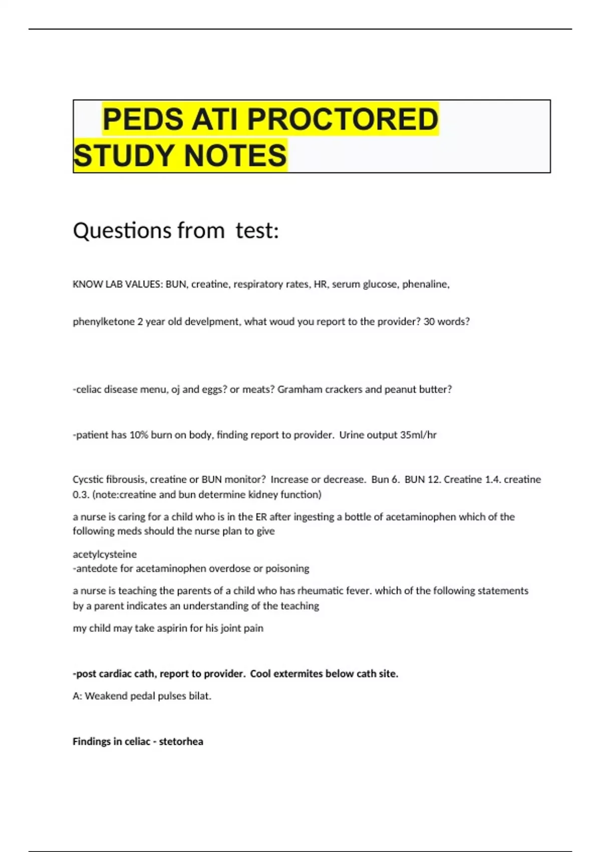 PEDS ATI PROCTORED STUDY NOTES Questions from test: KNOW LAB VALUES: BUN, creatine, respiratory rates, HR, serum glucose, phenaline, phenylketone 2 year old develpment, what woud you report to the provider? 30 words? -celiac disease menu, oj and eggs? or meats? Gramham crackers and peanut butter? -patient has 10% burn on body, finding report to provider. Urine output 35ml/hr Cycstic fibrousis, creatine or BUN monitor? Increase or decrease. Bun 6. BUN 12. Creatine 1.4. creatine 0.3. (note:creatine and bun determine kidney function) a nurse is caring for a child who is in the ER after ingesting a bottle of acetaminophen which of the following meds should the nurse plan to give acetylcysteine -antedote for acetaminophen overdose or poisoning a nurse is teaching the parents of a child who has rheumatic fever. which of the following statements by a parent indicates an understanding of the teaching my child may take aspirin for his joint pain -post cardiac cath, report to provider. Cool extermites below cath site. A: Weakend pedal pulses bilat. Findings in celiac - stetorhea -therapuetic effect for opiod pain? titrate till sedation (wrong)? After admin IV gentamacin for menningtits, following actions. Is and O's? Expected findings of appendicitis - The most common symptom of appendicitis is abdominal pain. Typically, symptoms begin as periumbilical or epigastric pain migrating to the right lower quadrant (RLQ) of the abdomen. Pt comes in with submersion injury, priority action. intubation? Iv? Priority Action for Submersion Injury - Signs and symptoms of near drowning include respiratory distress, tachypnea, rales, wheezing and possible hypothermia. Obviously, initial management includes the ABCs — Airway, Breathing and Circulation. Dornase alfa (pulmozyme) decreases viscosity of mucus and improves lung function. improvement monitored by pfts. use once daily. cycstic fib expected findings? absence of pancreatic enzymes, positive sputum culture, thick yellow-grey mucous, meconium ileus at birth, large loose fatty sticky foul smelling stools, distended abdomen, thin arm & legs, sweat tears saliva abnormally salty, viscous cervical mucous, absent/ decreased sperm. lab-sweat chloride test, normal <40 meq/l. stool analysis for azotorrhera (stinky from protein) and statorrhea (undigested fat). blood glucose. xray. -post tonsillectomy actions. straw? side lying? A: Comfort- ice collar/ keep throat moist/ pain meds. tonsil nursing actions: elevate head, asses for bleeding (clearing the throat, restlessness, bright red emesis, tachycardia/ pallor, frqt swallowing). Vitals/airways/ difficulty breathing. Comfort- ice collar/ keep throat moist/ pain meds. Diet- clear liquids/fluids after gag reflex returns. soft bland foods. No coughing/ throat clearing/ nose blowing/ no pointed object. Maybe blood tinged mucous or clots in vomit. -MMR at what age first. Answer: 12 months -manifest Otis medias A: tonislitits -management sleep terrors. Don’t wake patient? -Keep consistent bedtime routine -Use night-light in the room -Provide child with favorite toy -Leave drink of water by bed -Reassure preschoolers who are frightened, but avoid allowing them to sleep in parent's bed -diaper rash treatment. Antibacterial soap with each diaper change? Powder twice a day? -enteral feedings, flush tube or check gastric residual -epiglottis, what to do first. Contact/droplet precautions? -indicate protein deficiency? Dry, thinning hair -5 year old up to date with current immunizations get what at 5. Answer: VARICELLA (CORRECT). Others: dtap. Mmr, ipv a nurse is teaching parents of a 10 year old child who has iron deficiency anemia. which of the following statements by a parent indicates an understanding of the teaching. Will give with antacid. Will give with milk when can child with varicella come off droplet precautions. After lesions have scabbed. 24 after antibiotics when can patient come off precautions for menninggits. 24 after antibiotics. Negative blood culture. a nurse is caring for an 8 year old who has sickle cell anemia. which of the following actions should the nurse take A: give the child flavored popsicles -to maintain hydration to avoid sickling a nurse is assessing the pain level of a 3 year old child who is postop following abdominal surgery. which of the following pain scales should the nurse use FACES a nurse is caring for a 2 day old infant who has myelomeningocele. which of the following actions should the nurse take monitor the infant head circumference -increased risk for hydrocephalus a nurse is teaching the parents of a 4 month old infant who has gastroesophageal reflux which of the following statements by the parent indicates an understanding of the teachign i will add 1 tsp of rice cereal per oz to my babys formula -osteomyelitis intervention, diet?, physical activity? -sickle cell teaching parents, signs look for at home -atraumatic care IM injection? Pacifier with sucrose before injection or use 20 gauge -gas inhale, findings. Polyuria? -how to rehydrate patient vomiting for 3 days. Oral rehydration. Sodium 0.9 IV. -90/90 skeletal traction after scoliosis surgery. Use two people to turn patient? Air mattress? -question where one answer is facial twitching -pain scale for a 3 year old? Oucher? Visual pain scale? -acyt acid ingested, findings. -adloscent want to be screen for STI. Answer: have patient sign conscent form. Do not need parents conscent for STI’s -preschooler sibling dies. Curious what happens to the body after death A nurse is caring for a child who is postop following a tonsillectomy. which of the following findings is the nurses priority A: frequent swallowing a nurse is assessing a toddler who has measles (rubeola) which of the following findings should the nurse expect Koplik spots. Show on the diagram where kolpik spot found. A. Inside mouth a nurse is providing teaching to an adolescent who has scoliosis and a new prescription for a Boston brace. which of the following respo