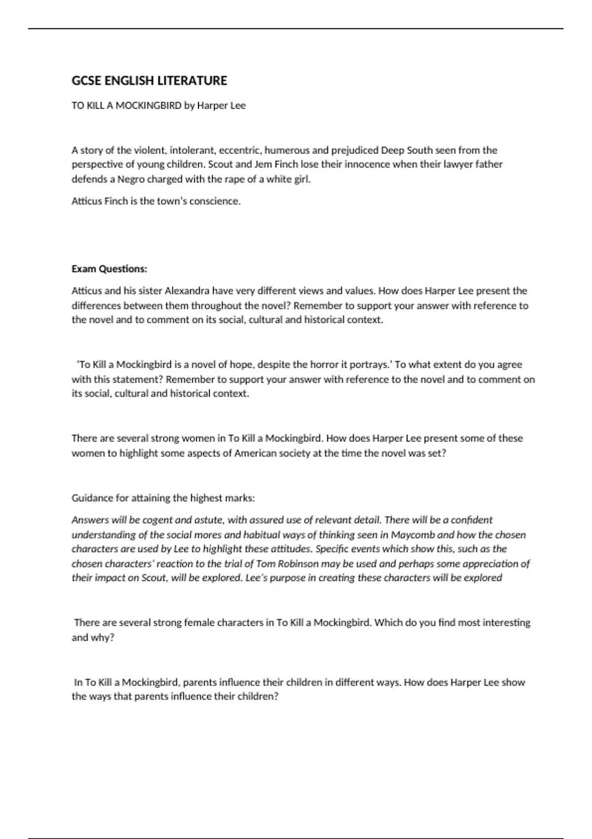 GCSE essay questions on "To Kill a Mockingbird" with additional revision notes