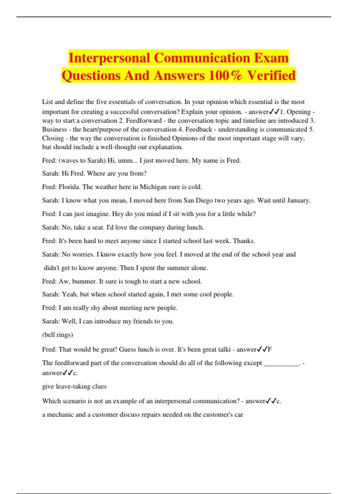 Interpersonal Communication Exam Questions And Answers 100% Verified List and define the five essentials of conversation. In your opinion which essential is the most important for creating a successful conversation? Explain your opinion. - answer1. Opening - way to start a conversation 2. Feedforward - the conversation topic and timeline are introduced 3. Business - the heart/purpose of the conversation 4. Feedback - understanding is communicated 5. Closing - the way the conversation is finished Opinions of the most important stage will vary, but should include a well-thought out explanation. Fred: (waves to Sarah) Hi, umm... I just moved here. My name is Fred. Sarah: Hi Fred. Where are you from? Fred: Florida. The weather here in Michigan sure is cold. Sarah: I know what you mean, I moved here from San Diego two years ago. Wait until January. Fred: I can just imagine. Hey do you mind if I sit with you for a little while? Sarah: No, take a seat. I'd love the company during lunch. Fred: It's been hard to meet anyone since I started school last week. Thanks. Sarah: No worries. I know exactly how you feel. I moved at the end of the school year and didn't get to know anyone. Then I spent the summer alone. Fred: Aw, bummer. It sure is tough to start a new school. Sarah: Yeah, but when school started again, I met some cool people. Fred: I am really shy about meeting new people. Sarah: Well, I can introduce my friends to you. (bell rings) Fred: That would be great! Guess lunch is over. It's been great talki - answerF The feedforward part of the conversation should do all of the following except __________. - answerc. give leave-taking clues Which scenario is not an example of an interpersonal communication? - answerc. a mechanic and a customer discuss repairs needed on the customer's car