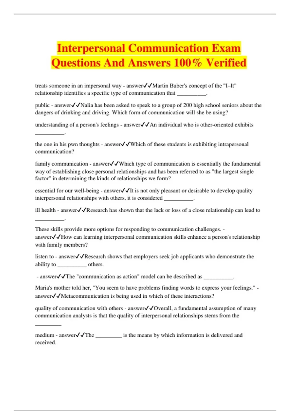 Interpersonal Communication Exam Questions And Answers 100% Verified treats someone in an impersonal way - answerMartin Buber's concept of the "I‒It" relationship identifies a specific type of communication that __________. public - answerNalia has been asked to speak to a group of 200 high school seniors about the dangers of drinking and driving. Which form of communication will she be using? understanding of a person's feelings - answerAn individual who is other-oriented exhibits __________. the one in his pwn thoughts - answerWhich of these students is exhibiting intrapersonal communication? family communication - answerWhich type of communication is essentially the fundamental way of establishing close personal relationships and has been referred to as "the largest single factor" in determining the kinds of relationships we form? essential for our well-being - answerIt is not only pleasant or desirable to develop quality interpersonal relationships with others, it is considered __________. ill health - answerResearch has shown that the lack or loss of a close relationship can lead to __________. These skills provide more options for responding to communication challenges. - answerHow can learning interpersonal communication skills enhance a person's relationship with family members? listen to - answerResearch shows that employers seek job applicants who demonstrate the ability to __________ others. - answerThe "communication as action" model can be described as __________. Maria's mother told her, "You seem to have problems finding words to express your feelings." - answerMetacommunication is being used in which of these interactions? quality of communication with others - answerOverall, a fundamental assumption of many communication analysts is that the quality of interpersonal relationships stems from the _________ medium - answerThe _________ is the means by which information is delivered and received.