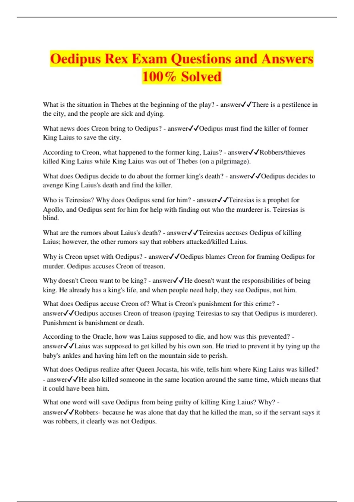 Oedipus Rex Exam Questions and Answers 100% Solved What is the situation in Thebes at the beginning of the play? - answerThere is a pestilence in the city, and the people are sick and dying. What news does Creon bring to Oedipus? - answerOedipus must find the killer of former King Laius to save the city. According to Creon, what happened to the former king, Laius? - answerRobbers/thieves killed King Laius while King Laius was out of Thebes (on a pilgrimage). What does Oedipus decide to do about the former king's death? - answerOedipus decides to avenge King Laius's death and find the killer. Who is Teiresias? Why does Oedipus send for him? - answerTeiresias is a prophet for Apollo, and Oedipus sent for him for help with finding out who the murderer is. Teiresias is blind. What are the rumors about Laius's death? - answerTeiresias accuses Oedipus of killing Laius; however, the other rumors say that robbers attacked/killed Laius. Why is Creon upset with Oedipus? - answerOedipus blames Creon for framing Oedipus for murder. Oedipus accuses Creon of treason.