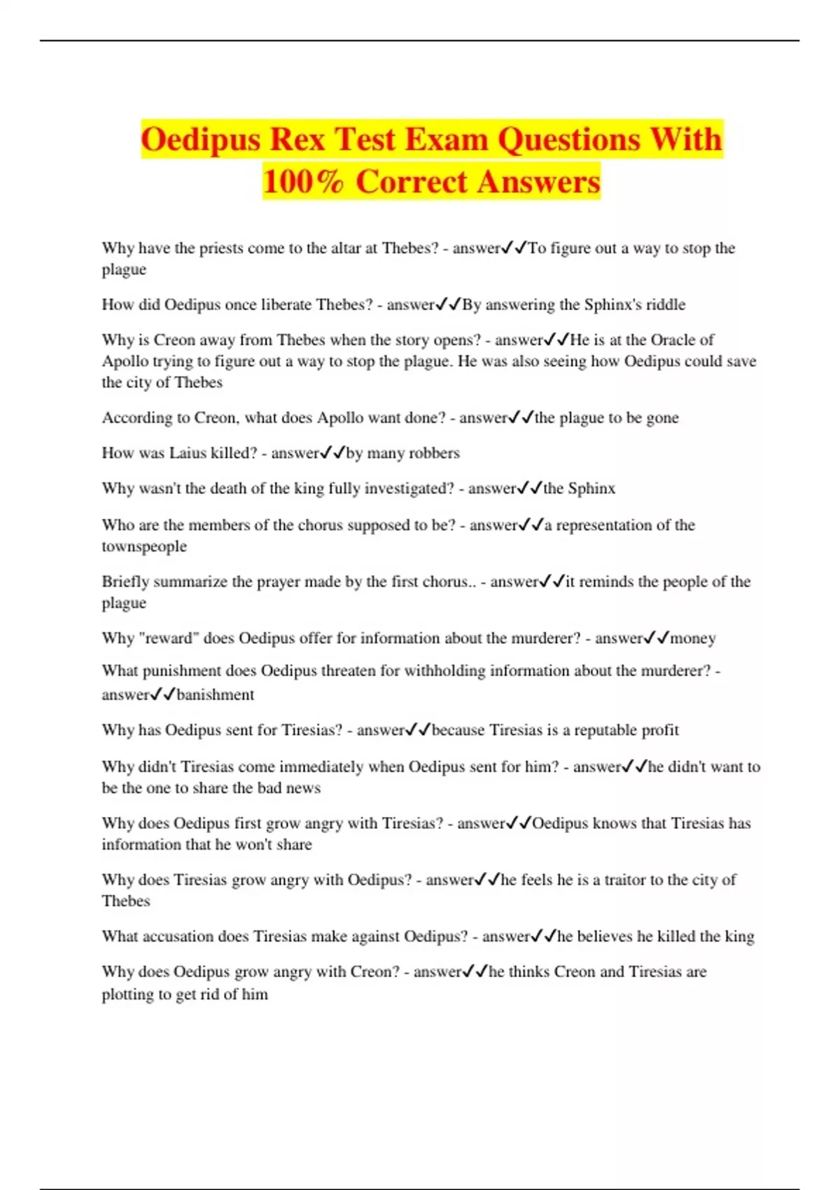Oedipus Rex Test Exam Questions With 100% Correct Answers Why have the priests come to the altar at Thebes? - answerTo figure out a way to stop the plague How did Oedipus once liberate Thebes? - answerBy answering the Sphinx's riddle Why is Creon away from Thebes when the story opens? - answerHe is at the Oracle of Apollo trying to figure out a way to stop the plague. He was also seeing how Oedipus could save the city of Thebes According to Creon, what does Apollo want done? - answerthe plague to be gone How was Laius killed? - answerby many robbers Why wasn't the death of the king fully investigated? - answerthe Sphinx Who are the members of the chorus supposed to be? - answera representation of the townspeople Briefly summarize the prayer made by the first chorus.. - answerit reminds the people of the plague Why "reward" does Oedipus offer for information about the murderer? - answermoney What punishment does Oedipus threaten for withholding information about the murderer? - answerbanishment Why has Oedipus sent for Tiresias? - answerbecause Tiresias is a reputable profit Why didn't Tiresias come immediately when Oedipus sent for him? - answerhe didn't want to be the one to share the bad news Why does Oedipus first grow angry with Tiresias? - answerOedipus knows that Tiresias has information that he won't share Why does Tiresias grow angry with Oedipus? - answerhe feels he is a traitor to the city of Thebes What accusation does Tiresias make against Oedipus? - answerhe believes he killed the king Why does Oedipus grow angry with Creon? - answerhe thinks Creon and Tiresias are plotting to get rid of him What prediction does Tiresias m
