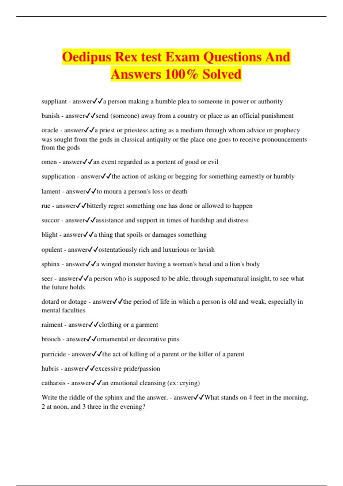 Oedipus Rex test Exam Questions And Answers 100% Solved suppliant - answera person making a humble plea to someone in power or authority banish - answersend (someone) away from a country or place as an official punishment oracle - answera priest or priestess acting as a medium through whom advice or prophecy was sought from the gods in classical antiquity or the place one goes to receive pronouncements from the gods omen - answeran event regarded as a portent of good or evil supplication - answerthe action of asking or begging for something earnestly or humbly lament - answerto mourn a person's loss or death rue - answerbitterly regret something one has done or allowed to happen succor - answerassistance and support in times of hardship and distress blight - answera thing that spoils or damages something opulent - answerostentatiously rich and luxurious or lavish sphinx - answera winged monster having a woman's head and a lion's body seer - answera person who is supposed to be able, through supernatural insight, to see what the future holds dotard or dotage - answerthe period of life in which a person is old and weak, especially in mental faculties raiment - answerclothing or a garment brooch - answerornamental or decorative pins parricide - answerthe act of killing of a parent or the killer of a parent hubris - answerexcessive pride/passion catharsis - answeran emotional cleansing (ex: crying) Write the riddle of the sphinx and the answer. - answerWhat stands on 4 feet in the morning, 2 at noon, and 3 three in the evening?