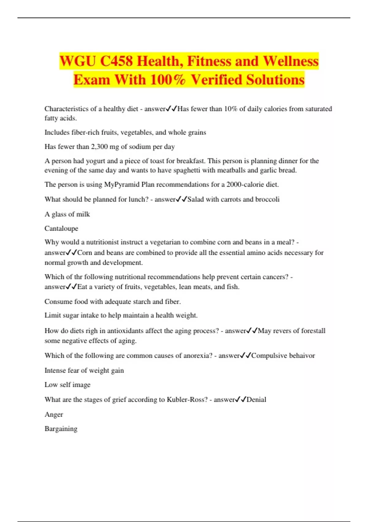 WGU C458 Health, Fitness and Wellness Exam With 100% Verified Solutions Characteristics of a healthy diet - answerHas fewer than 10% of daily calories from saturated fatty acids. Includes fiber-rich fruits, vegetables, and whole grains Has fewer than 2,300 mg of sodium per day A person had yogurt and a piece of toast for breakfast. This person is planning dinner for the evening of the same day and wants to have spaghetti with meatballs and garlic bread. The person is using MyPyramid Plan recommendations for a 2000-calorie diet. What should be planned for lunch? - answerSalad with carrots and broccoli A glass of milk Cantaloupe Why would a nutritionist instruct a vegetarian to combine corn and beans in a meal? - answerCorn and beans are combined to provide all the essential amino acids necessary for normal growth and development. Which of thr following nutritional recommendations help prevent certain cancers? - answerEat a variety of fruits, vegetables, lean meats, and fish. Consume food with adequate starch and fiber. Limit sugar intake to help maintain a health weight. How do diets righ in antioxidants affect the aging process? - answerMay revers of forestall some negative effects of aging. Which of the following are common causes of anorexia? - answerCompulsive behaivor Intense fear of weight gain Low self image What are the stages of grief according to Kubler-Ross? - answerDenial Anger Bargaining