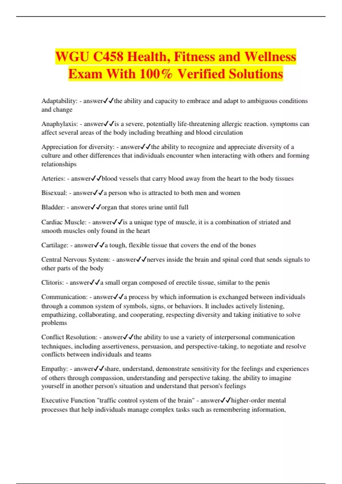 WGU C458 Health, Fitness and Wellness Exam With 100% Verified Solutions Adaptability: - answerthe ability and capacity to embrace and adapt to ambiguous conditions and change Anaphylaxis: - answeris a severe, potentially life-threatening allergic reaction. symptoms can affect several areas of the body including breathing and blood circulation Appreciation for diversity: - answerthe ability to recognize and appreciate diversity of a culture and other differences that individuals encounter when interacting with others and forming relationships Arteries: - answerblood vessels that carry blood away from the heart to the body tissues Bisexual: - answera person who is attracted to both men and women Bladder: - answerorgan that stores urine until full Cardiac Muscle: - answeris a unique type of muscle, it is a combination of striated and smooth muscles only found in the heart Cartilage: - answera tough, flexible tissue that covers the end of the bones Central Nervous System: - answernerves inside the brain and spinal cord that sends signals to other parts of the body Clitoris: - answera small organ composed of erectile tissue, similar to the penis Communication: - answera process by which information is exchanged between individuals through a common system of symbols, signs, or behaviors. It includes actively listening, empathizing, collaborating, and cooperating, respecting diversity and taking initiative to solve problems Conflict Resolution: - answerthe ability to use a variety of interpersonal communication techniques, including assertiveness, persuasion, and perspective-taking, to negotiate and resolve conflicts between individuals and teams Empathy: - answershare, understand, demonstrate sensitivity for the feelings and experiences of others through compassion, understanding and perspective taking. the ability to imagine yourself in another person's situation and understand that person's feelings Executive Function "traffic control system of the brain" - answerhigher-order mental processes that help individuals manage complex tasks such as remembering information, problem solving, and regulating emotions. people with these skills are able to think critically and make responsible decisions. they are also flexible thinkers who can innovate to find new ways to solve problems. they help people learn and grow through their lives Gallbladder: - answerorgan that stores bile that is used to digest and absorb fats Gay: - answera homosexual person(that typically refers to a man) Gender: - answersocial and cultural distinctions associated with being male, female or intersex Goal Setting: - answeridentify value-based personal and professional milestones and establish a fixed timeline and action steps to achieve them Growth Mindset: - answerthe belief that through behaviors and language, one can develop and improve their skills and abilities over time, and these are not "fixed" based on natural intellect or talent Healthy Relationship: - answerrelationship that generates respect and honesty between both people Hemorrhagic: - answerwhen a blood vessel in the brain bursts Hetersexual: - answera person who is attracted to the members of the opposite sex Homeostasis: - answera state of balance among all body systems needed for the body to survive and function correctly Intersex: - answerindividuals who cannot be distinctly identified as male or female due to variations in sex characteristics or whose hormonal and chromosomal make up does not match their biological sex Ischemic Stroke: - answerwhen the blood supply to the brain is blocked Joint: - answeran area where two bones come together Kidneys: - answertwo bean-shaped organs located in the abdominal cavity on either side of the spine that are responsible for producing urine Labia: - answera set of lips that surround and protect the vagina, that connects the internal reproductive organs to the outside of the body Lesbain: - answera homosexual women Liagment: - answera connective tissue that binds one bone to another Liver: - answerorgan that metabolizes large nutrients produces bile and detoxifies the body(proteins, fats)